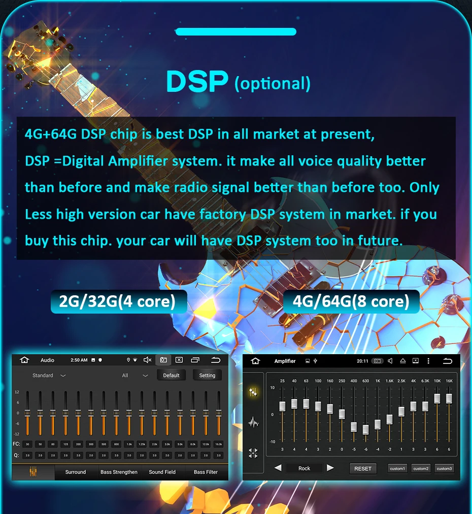 Чипы Радио использует лучшие радио chip-NXP6686 и лучший усилитель chip-TDA7851L. Чип NXP6686 является лучшим радиочипом, и лучше than7708,6851 и любой другой радиочип. Это лучший радиочип на рынке в настоящее время. Хороший радиочип делает радиосигнал более сильным. TDA7851L является лучшим амплитудным IC на рынке в настоящее время. Лучше, чем 7388, и все остальные. Это делает качество звука автомобиля лучше, чем у других типов радио. Если вам нужно лучшее качество звука, мы предлагаем вам также выбрать функцию DSP, DSP-это система цифрового усилителя, которая предлагает лучшее качество звука.