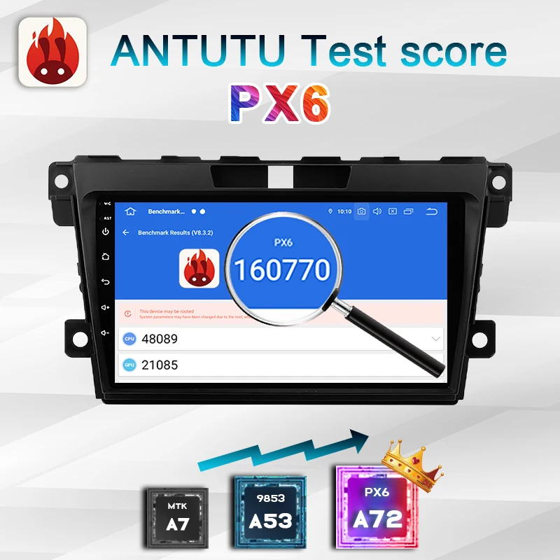 PX6 PX6 является лучшим чипом на рынке в настоящее время, он работает быстрее, чем все другие типы. Балл ANTUTU составляет 160770, что лучше 9853 4G + 64G, PX5 и всех других типов 4 + 64G на рынке. По сравнению с другими радио типа fo, PX6 radio может загружать больше видов приложений android с android market, и приложение может работать лучше.
