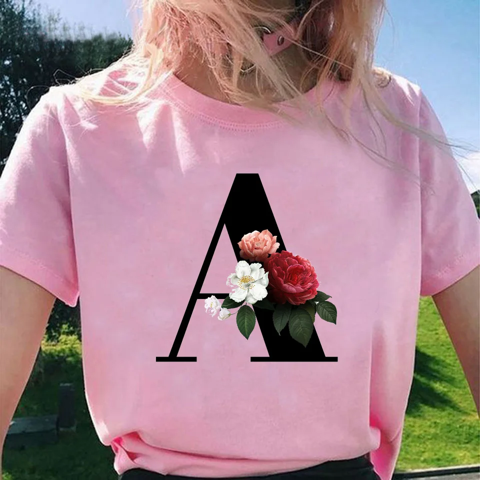 Женская футболка с принтом алфавита, Элегантная футболка с цветочным принтом, 26 цветов, в стиле Харадзюку, 2020