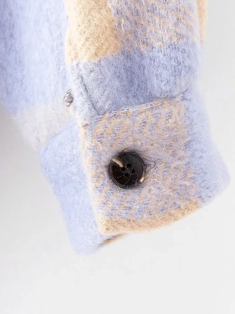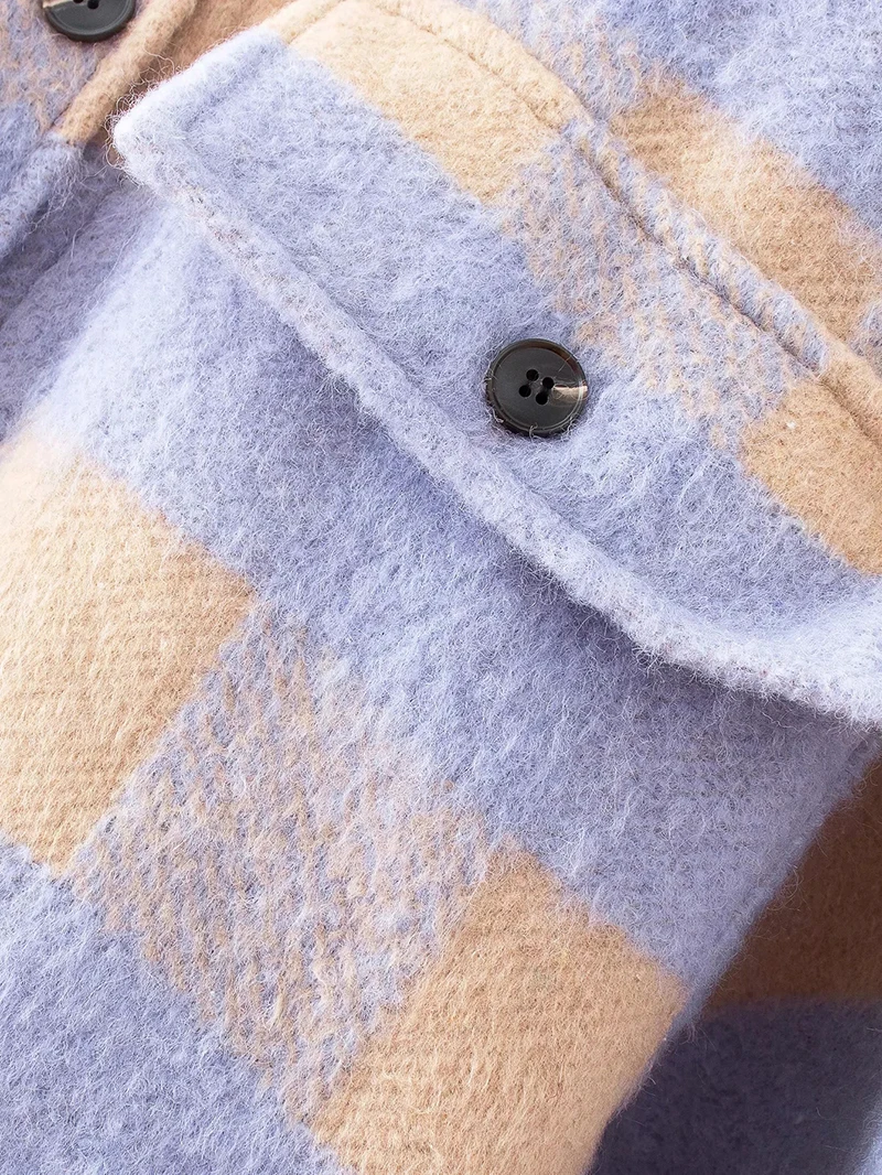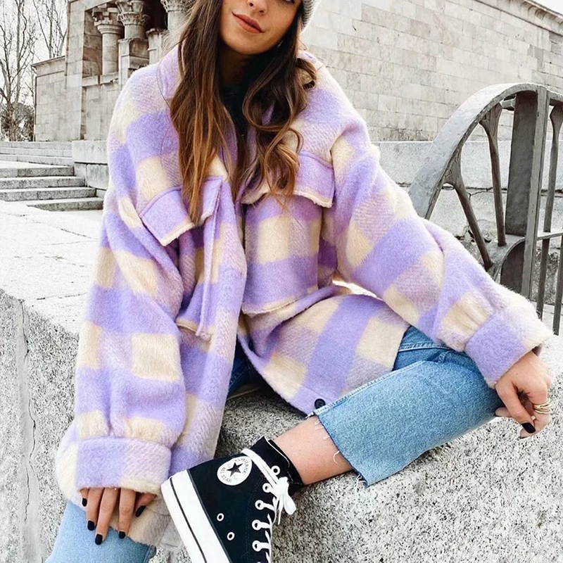 Рубашка женская шерстяная, оверсайз, в шотландскую клетку, фиолетовая, 2021