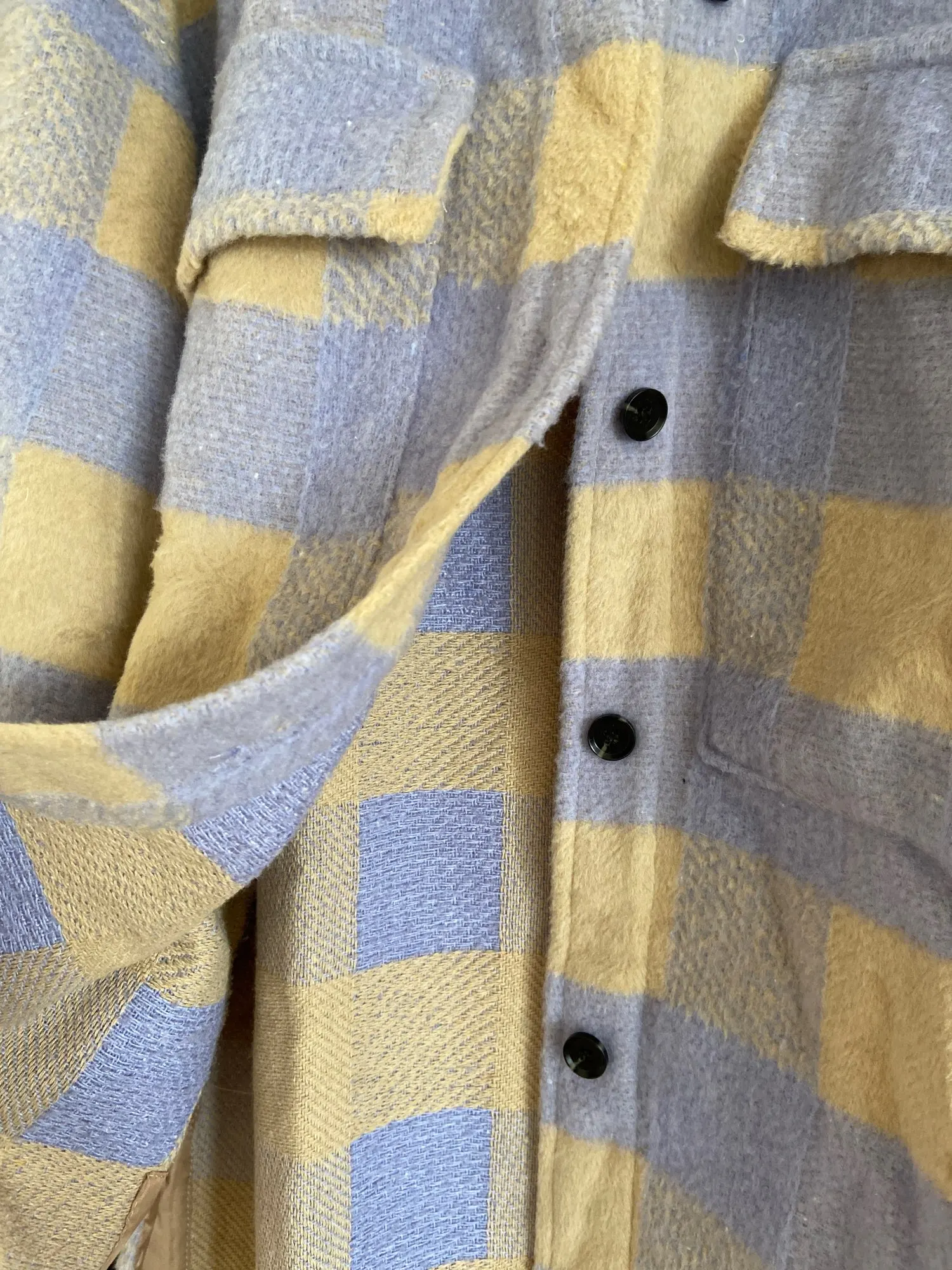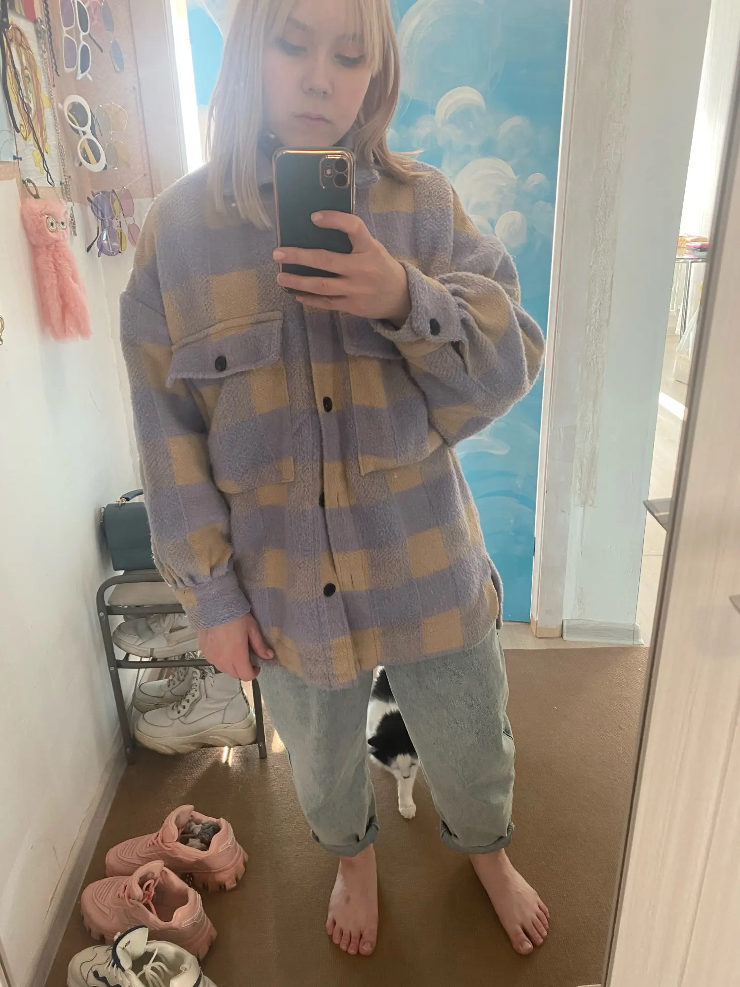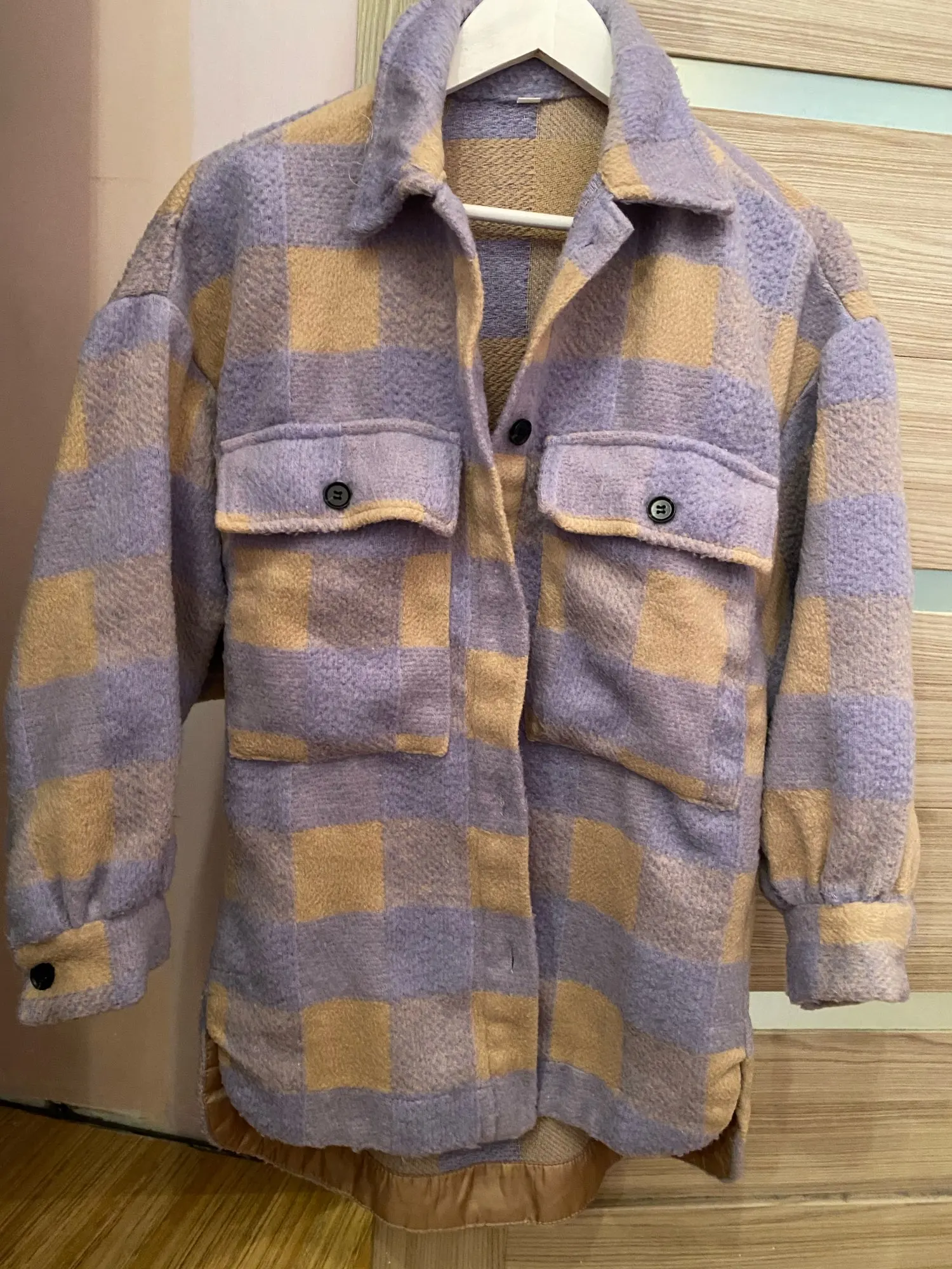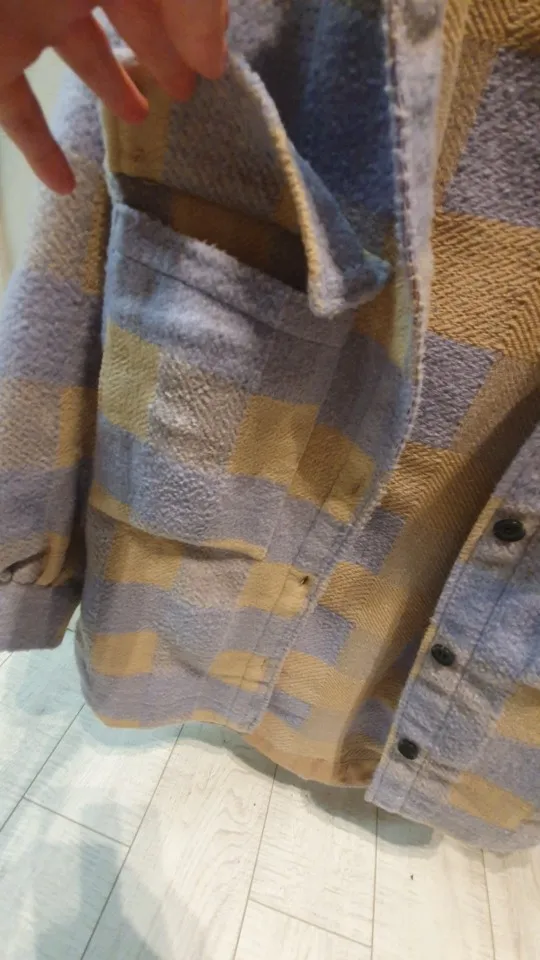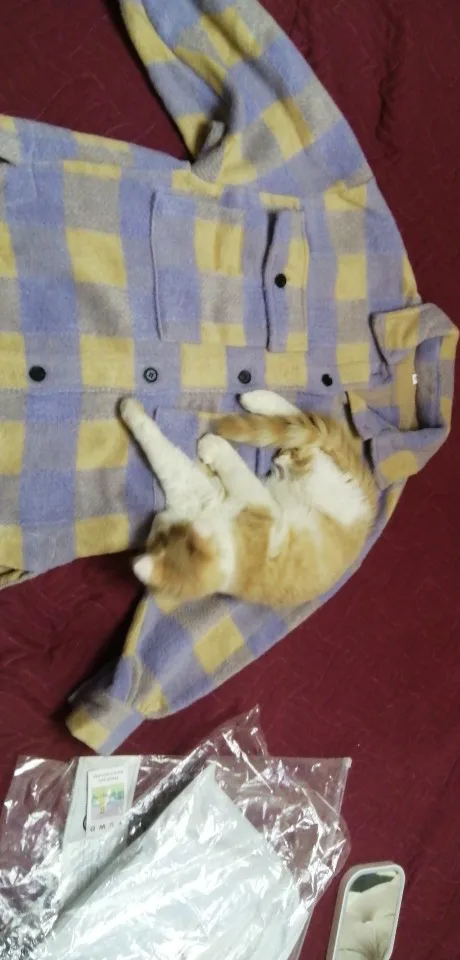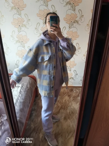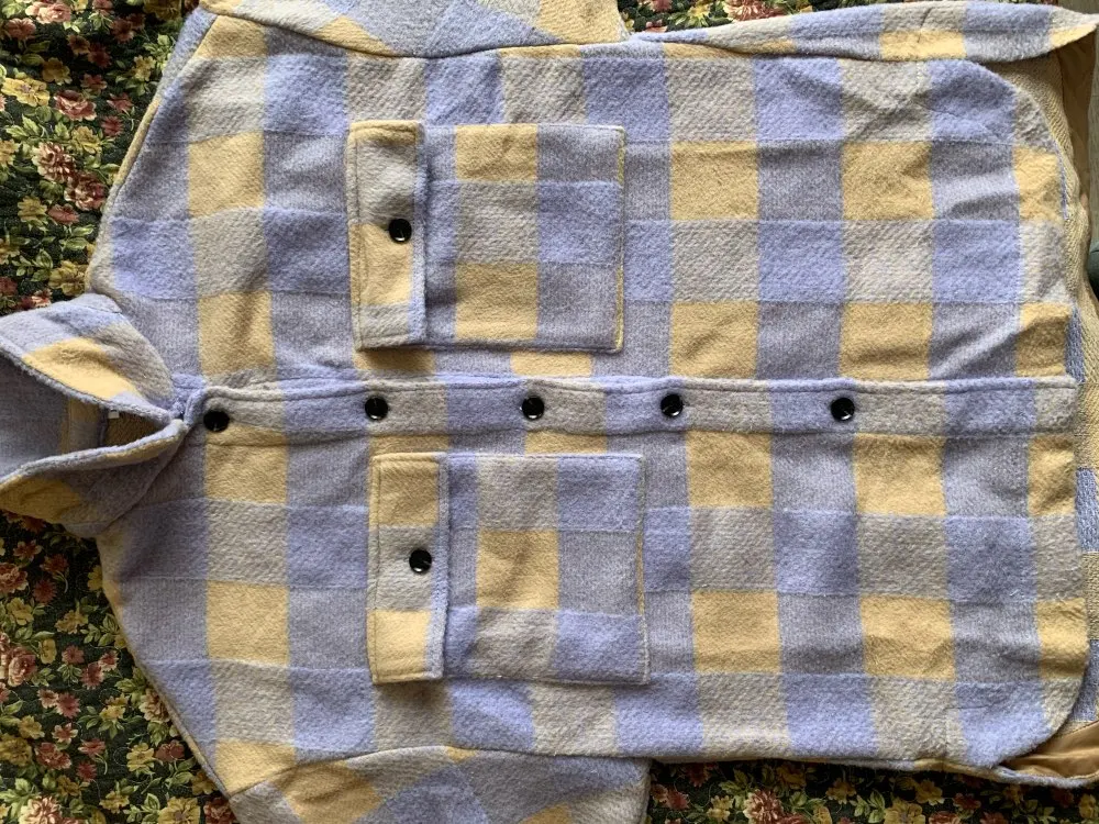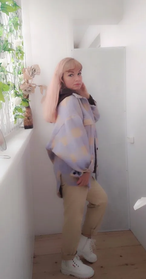 Думала буду носить как рубашку, но из-за кроя рукавов надевать что-то сверху очень неудобно. Но и как верхняя одежда рубашка подойдёт разве что на не очень холодную весну. Материал, конечно, синтетический, не самый приятный. Попробую ее разгладить, очень топорщится, посмотрим что выйдет.