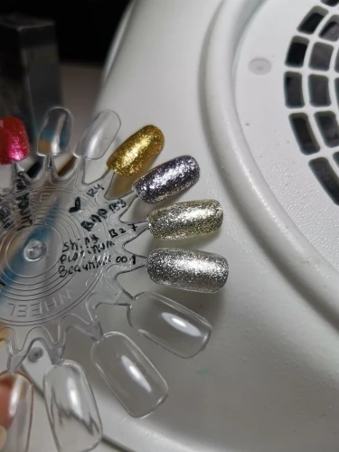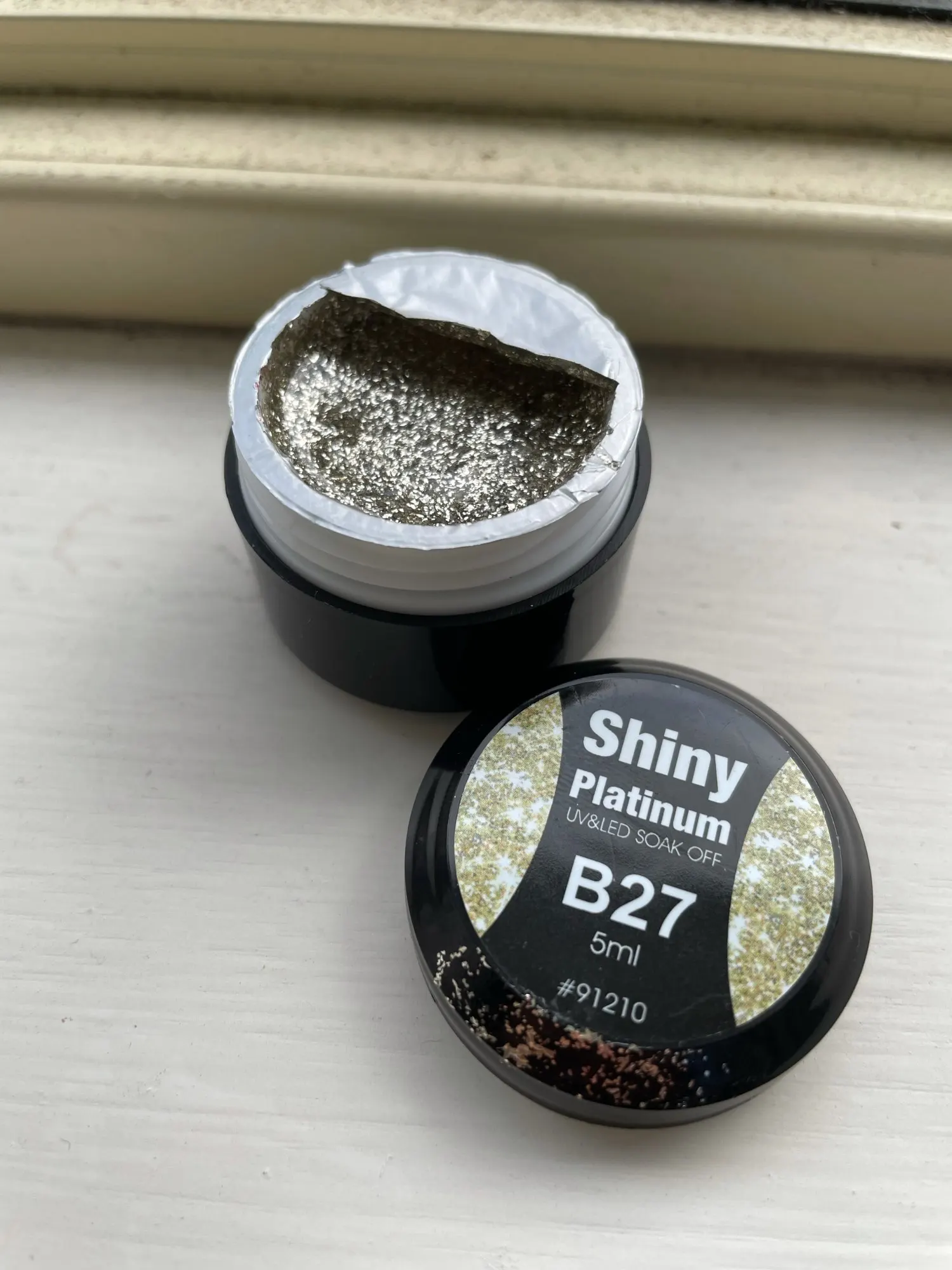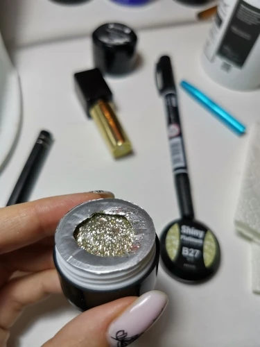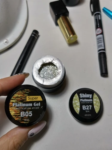 Получила совсем не то, что ожидала. До этого здесь брала цвет В05 и он был идеальный плотный со множеством очень маленьких частиц и можно было покрыть без проплешин в один слой. Оттенок В27 уже совсем другой, там частицы разных размеров и покрывает не плотно. Мне нужна была очень плотная блестящая краска для прорисовки тонких линий и френча, а с этим такого не добиться. P.s на палитре для примера рядом серебристый цвет от Бьютилюкс: сравните плотность покрытия. Им идеально рисовать френч без проплешин. У продавца здесь представлены разные товары, будьте внимательны.