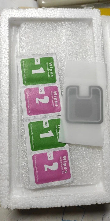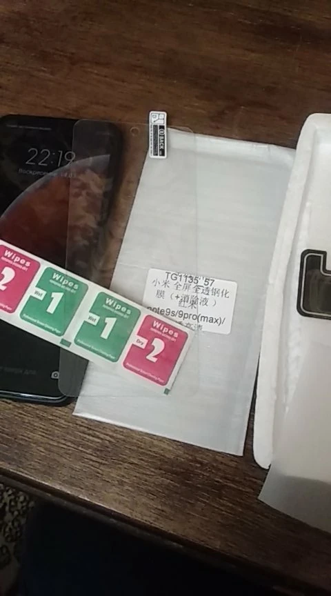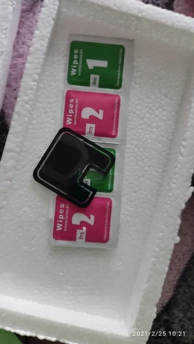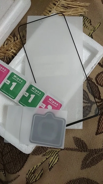 пластиковая упаковка повреждена, но стекло в целости, надеюсь пленка на объектив подойдёт, пока что не понятно как её совместить, не вскрывая защитную пленку, после приклеивания отпишусь о качестве поклейки, жидкость для проклейки краёв стекла тоже есть