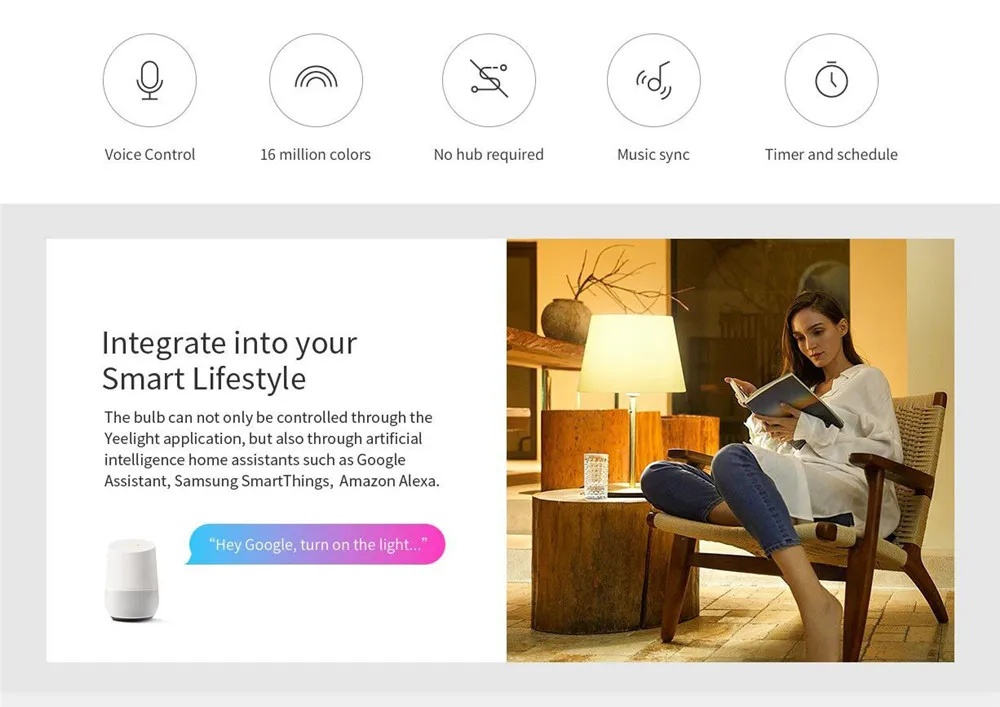 Голосовое управление, работает без диванаСветодиодный смарт-лампочка Yeelight 1SE поддерживает Голосовое управление, что избавляет вас от проблем с включением/выключением ламп. Поддержка Google Assistant, Samsung SmartThings, Amazon Alexa.16 миллионов цветов для удовлетворения ваших потребностейДоступно 16 миллионов цветов, которые могут изменить яркие цвета в соответствии с различными потребностями фестиваля и сцены. Вы можете свободно переключать цвета. Различные сцены Освещения Создают различные атмосферные эффекты для вас.Выбор цвета, в сочетании с функциональностью и весельемКогда вы указываете область сканирования лампы на предмет, цветной светильник может изменить цвет объекта в режиме реального времени. Эта функция увеличивает ваше взаимодействие с лампой-светильник, а также увеличивает удовольствие от лампы-светильник.Регулировка цветовой температуры, всегда самый удобный светильникСветодиодный смарт-лампочка Yeelight 1SE может регулировать яркость и цветовую температуру. Холодный белый светильник с высокой яркостью и цветовой температурой может использоваться для создания чистой рабочей среды. Используйте теплый желтый светильник с низкой яркостью и цветовой температурой для создания комфортной среды для сна.Синхронизация света с музыкойИнтеллектуальный светодиодный светильник Yeelight 1SE может синхронизировать ритм музыки, Режим музыки, лампа почувствует изменение окружающего ритма и может быть любого цвета. Отлично подходит для встреч с друзьями.6 Вт Ультра-низкое энергопотребление, больше энергосбереженияУмные светодиодные лампы Yeelight 1SE потребляют всего 6 Вт, энергосберегающие и с меньшей мощностью, чем обычные лампы накаливания.Режим лунного света поможет вам быстро заснутьКогда вы используете светильник в режиме Луны, он излучает светильник, как и удобный, как лунный светильник, так что вы можете спокойно спать.Другие особенностиПростая установка: прямая установка без ступицыТаймер ВКЛ/ВЫКЛ: вы можете установить переключатель лампы25000 часов (чип на плате) Срок службы: супер прочность и стабильностьХарактеристики:Основание винта: E27Номинальная мощность: 6 ВтНоминальная Входная мощность: 100-240V ~ 50/60Hz 0.07AЦветовая температура: 1700-6500KБеспроводной Подключение: беспроводной стандарт IEEE 802,11 b/g/n 2,4 ГГцСрок службы лампы: около 25000 часовРабочая температура: от-10 до + 40 градусов CВлажность: от 0 до 85% относительной влажностиЧастота: 2400 МГц-2483,5 МГцБренд: YeelightМодель: 1SEМатериал оболочки: АБС-пластикНапряжение (В): 100-240 В переменного токаСветовой поток: 650 люменовВремя работы: около 25000 часовФункции: WiFi, активация звуком, управление приложениемФункция: домашнее освещение, студийное и выставочное освещениеВ наличии светильник Цвет: белый, Цвет Фул, теплый белый, RGBПримечание:1) Управление лампой с помощью приложения yeelight / google Assistant / Smartthings и т. Д.