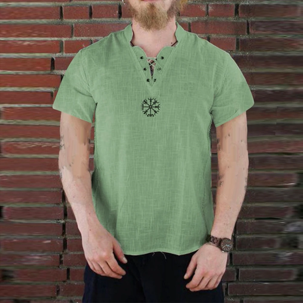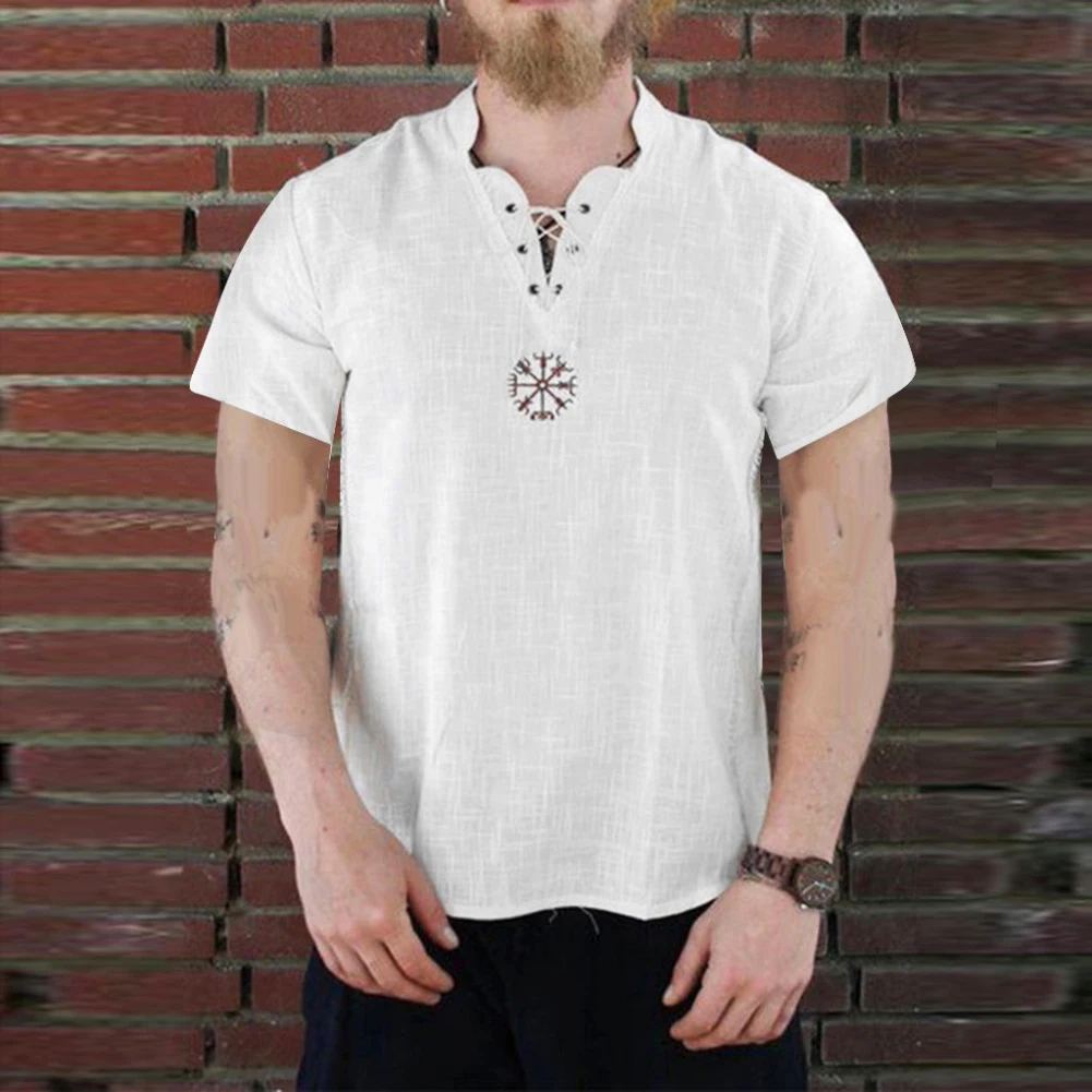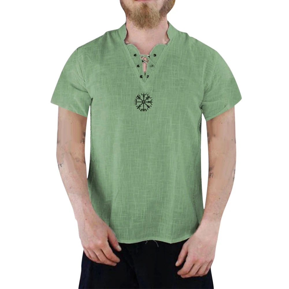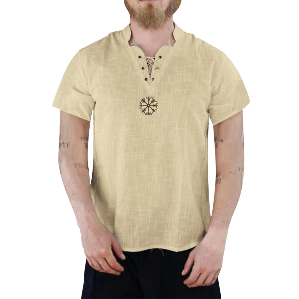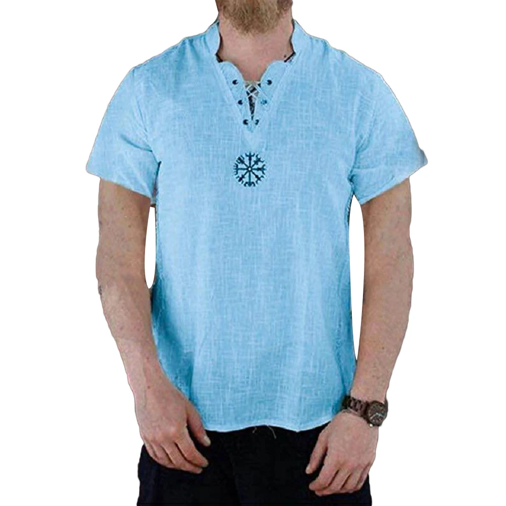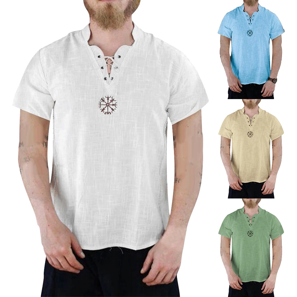 Блузка мужская с вышивкой, повседневная Однотонная рубашка с V-образным вырезом, с коротким рукавом, из хлопка и льна, дышащая удобная свободная