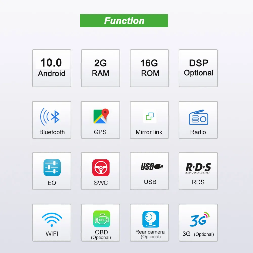 Поддержка 3G/4G (опционально), WIFI, Bluetooth, вход камеры заднего вида, gps-навигация, AUX;USB,