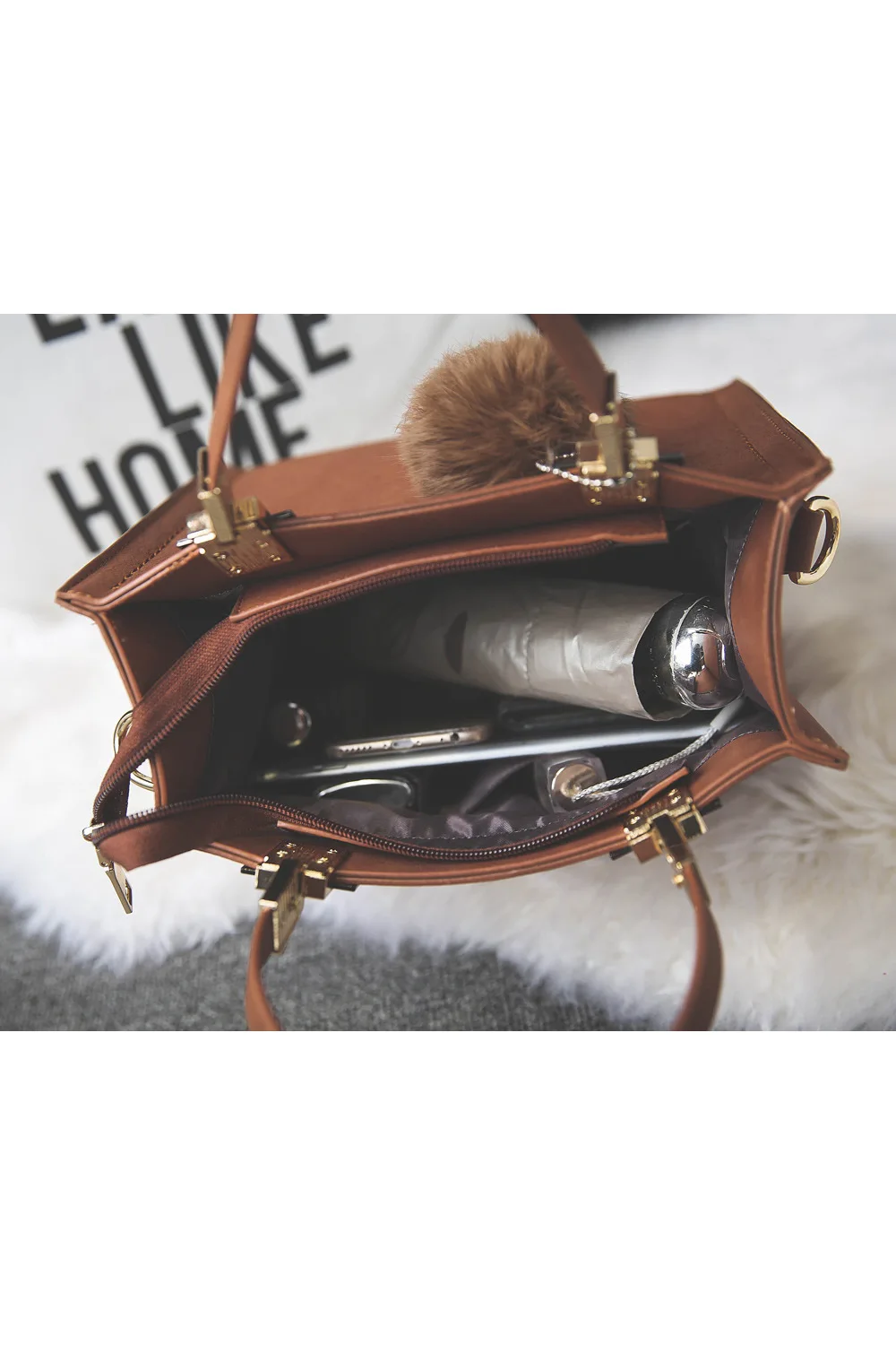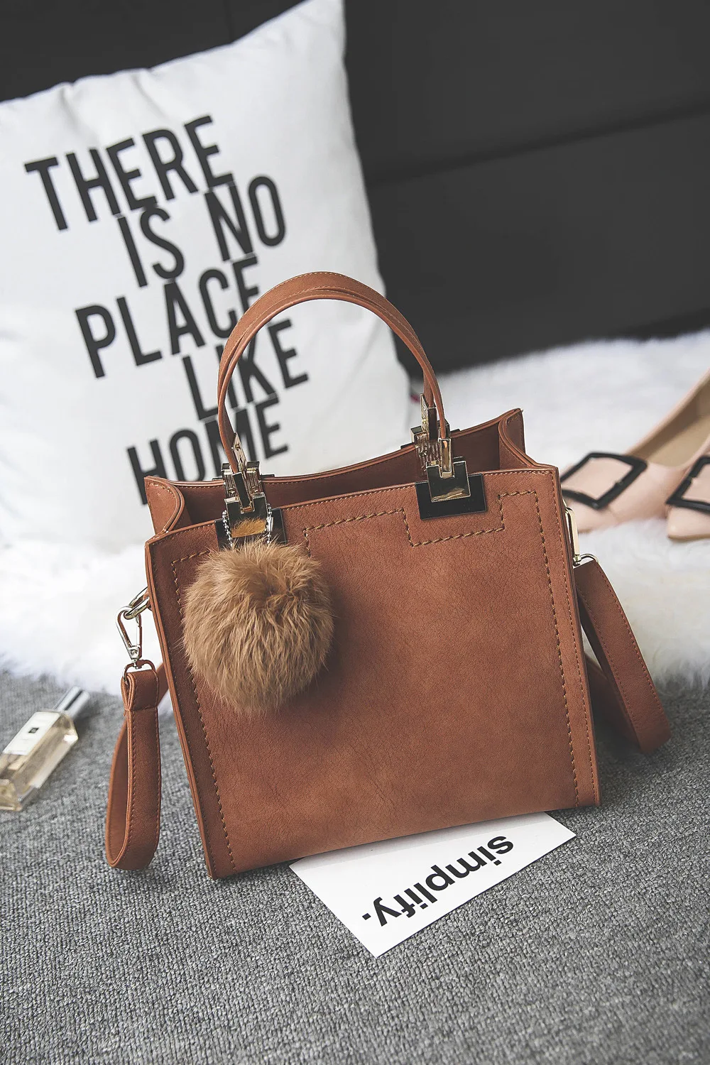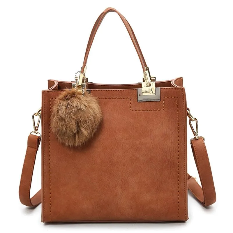 Сумка-тоут женская, из замши, на плечо, с меховым помпоном