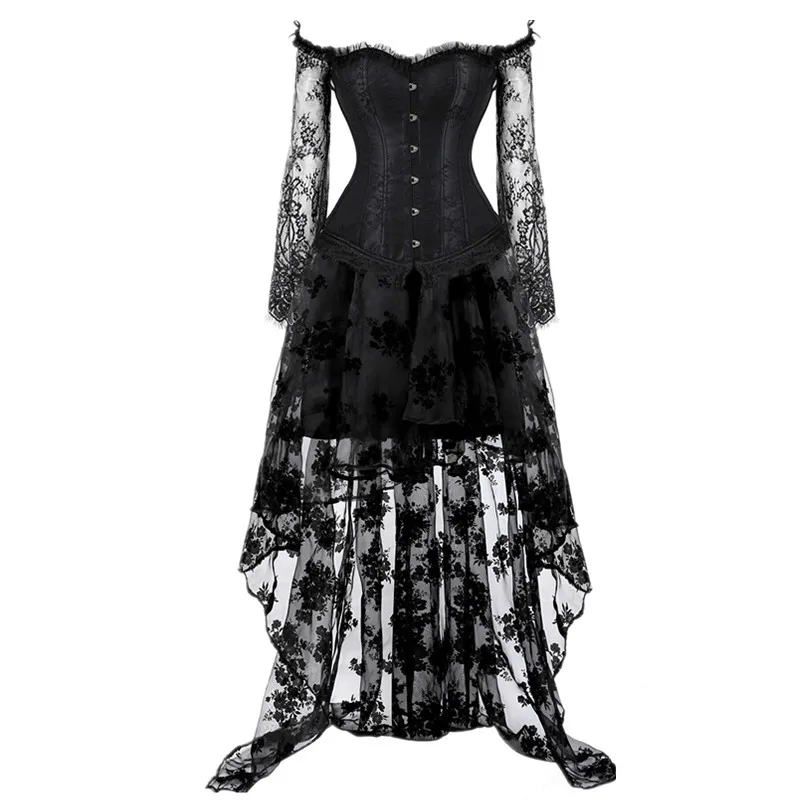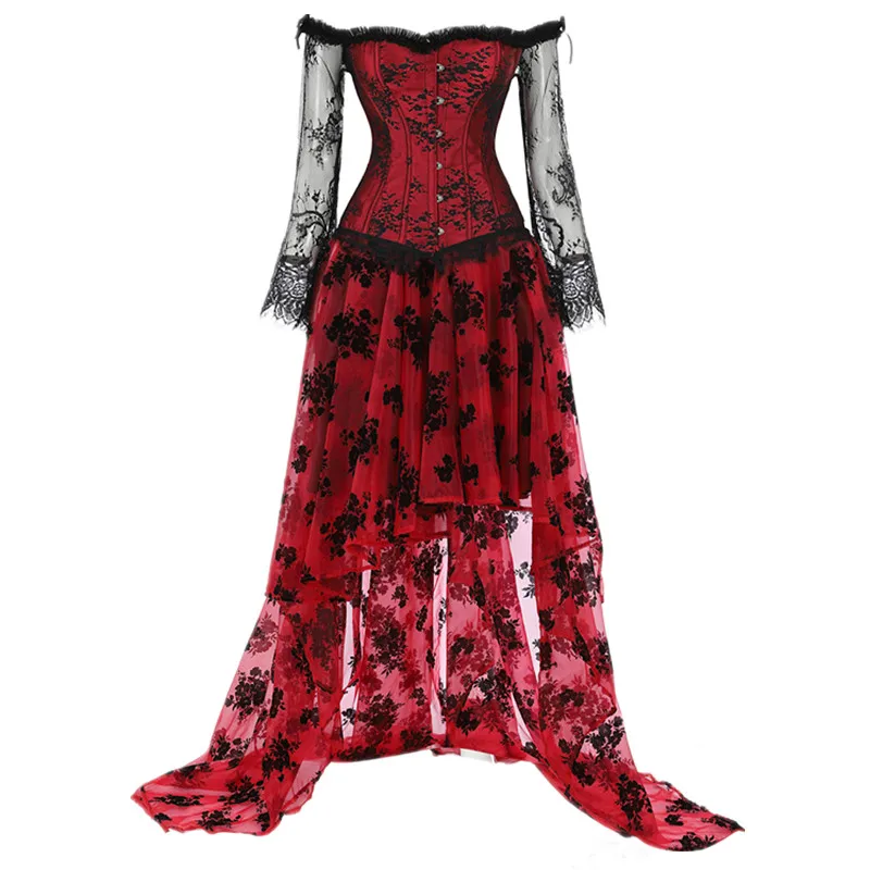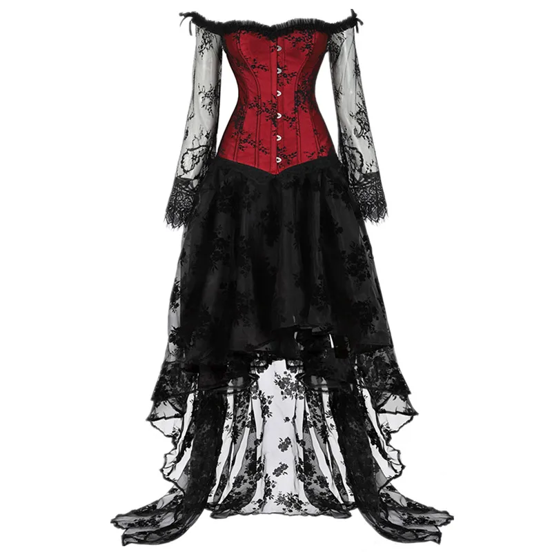Для женщин корсет в стиле стимпанк платье сексуальное кружевное платье с длинными рукавами спущенное плечо корсет Overbust размера плюс S-6XL