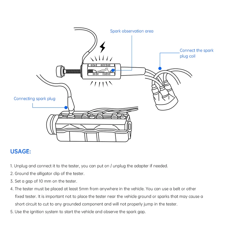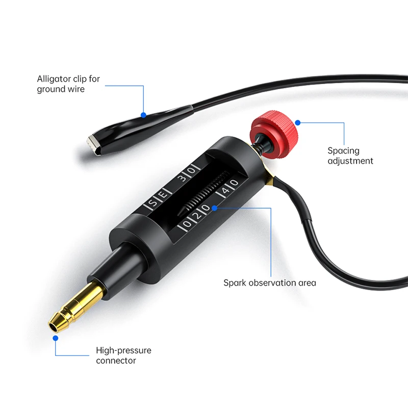 Определить качество катушки в зависимости от цвета искр и вспышек на расстоянии Интуитивно понятная и легкая эксплуатация катушки зажигания Зажим типа «крокодил» надежно фиксируется на земле Винт в сборе обеспечивает быструю и легкую регулировку зазора искры Избегайте пожара, перегорания катушки зажигания и т. д.