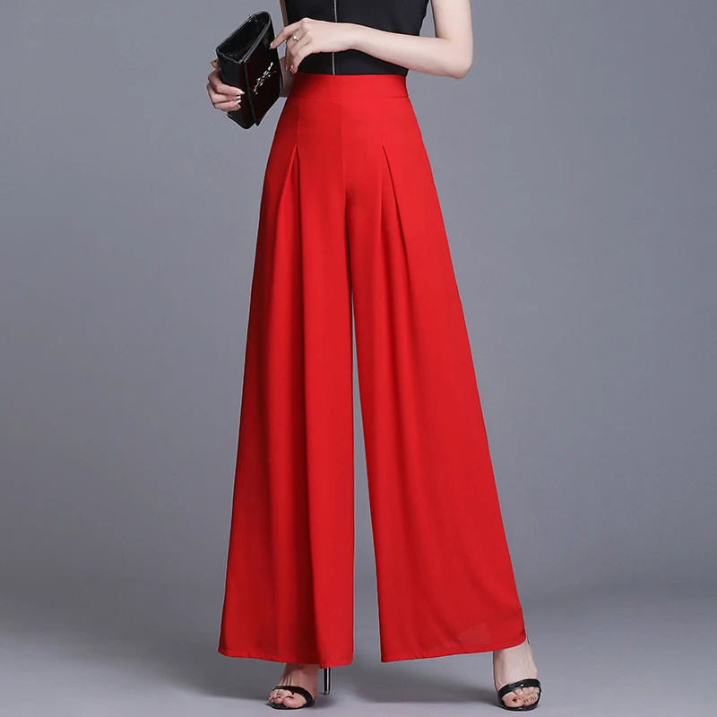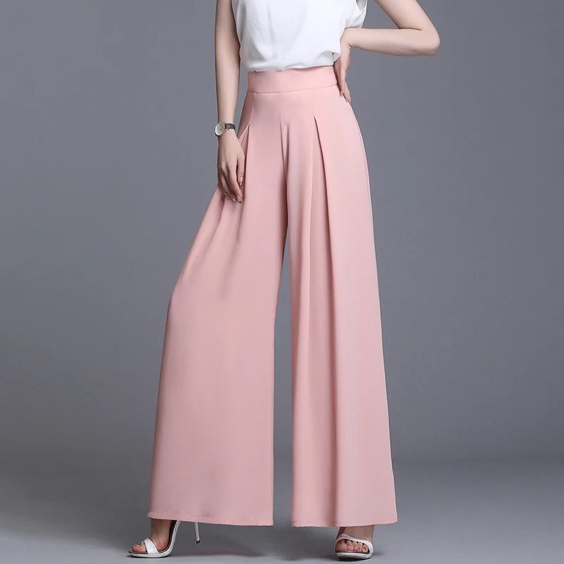 Женские шифоновые широкие брюки, летние однотонные черные плиссированные брюки с высокой талией, 2021