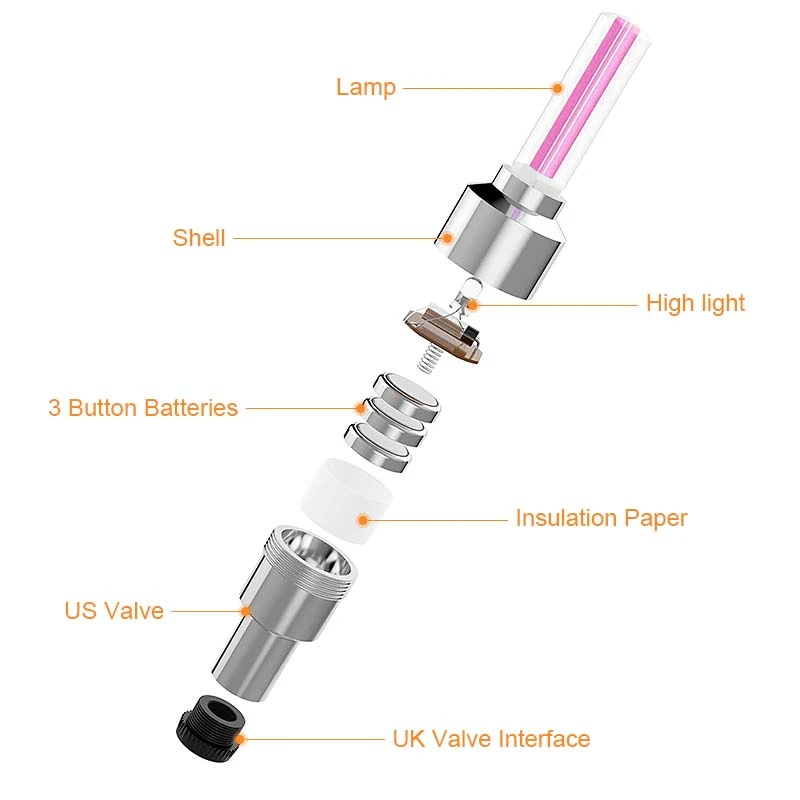 Особенности:Колпачок клапана шины закручивается на стержень клапана вашего велосипеда за считанные секунды.Универсальная установка и простота установки без специальных проводов, легко устанавливается и снимается.Серебристый корпус с ультра яркими и долговечными светодиодными лампами.Водонепроницаемый, ударопрочный.Питание от 3 батарей AG10. (включая батарею)