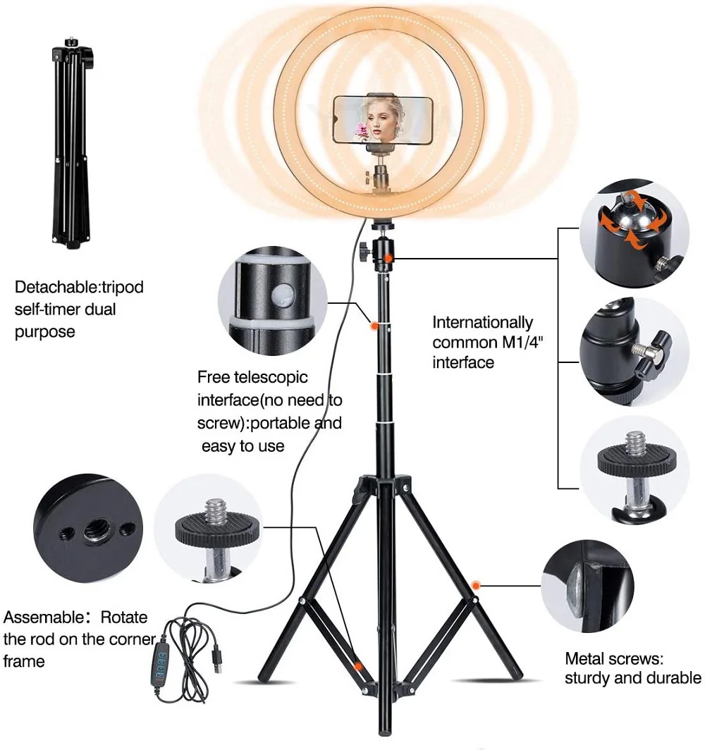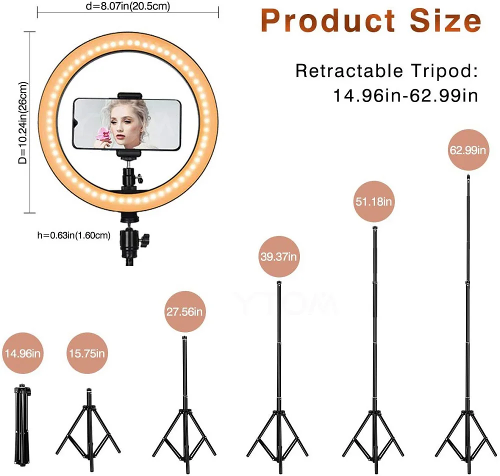 Характеристики:1).10 режимов яркости.2).3 цвета, плавный затемняющий светильник, белый светильник, теплый светильник, мягкий светильник.3).ytom 1,6 M Регулируемый светильник с подставкой подходит для универсальных высоких и очень стабильных.4). Со студией, чтобы заполнить светильник фото, портрет автоспуска заполняющий светильник.5).ytom Photo studio ring светодиодный светильник USB plug заполняющий светильник.6). Подходит для многих социальных, таких как создание, видео в режиме реального времени, студийный светильник, фотография