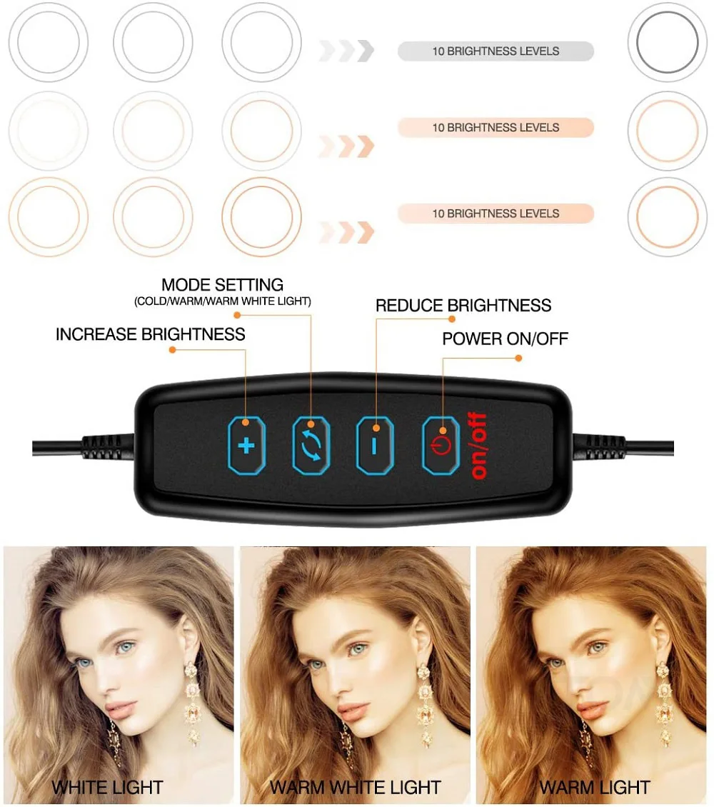 Название товара: видео живое кольцо для селфи светильникЗарядка: usb-разъемТип: кольцевой светильник с подставкой/кольцевой лампой для макияжаРегулируемая подставка для штатива: 35-160 смСветильник Размер: 26 см/10 в ДиаметрСветильник Цвет: белый светильник, теплый светильник, мягкий светильникМатериал: алюминий + ПКДиапазон затемнения: 1%-100%Цветовая температура: 3200K-5500KСветильник источник света: высокое качество светодиодный SMDМощность: 10 ВтСветодиодный светильник: 64 шт. светодиодный sИспользование: продукт/рекламная фотография, прямой светильник, косметический светильник, видео-студия для макияжа