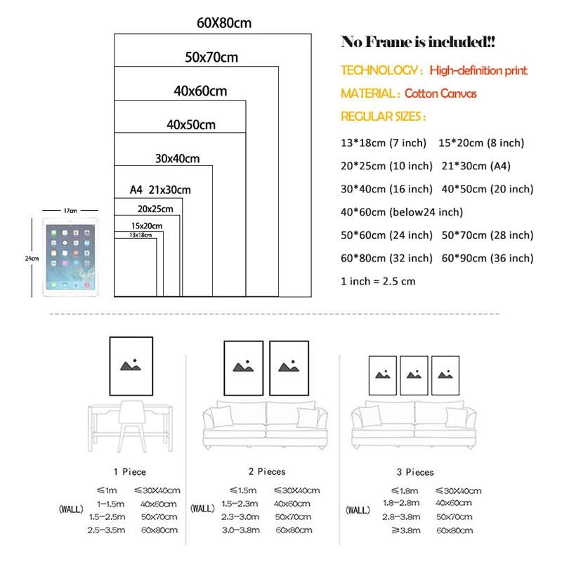1.-Материал: напечатанный на холсте высокого качества, нетоксичный, экологически чистый. 2.-доступны различные размеры, выберите подходящий вам размер. 3.-Нет рамы, рамы должны быть установлены локально, потому что они не могут быть транспортированы. 4.-Постер прибудет без границы, нет белых краев вокруг картины. Картина вырезана вручную, и погрешность в несколько миллиметров с прокрутки является нормальной, а не проблемы с качеством, независимо от того, вырезается ли она во время установки в соответствии с личными предпочтениями. 5.-Мы используем Упаковку бумажных труб, чтобы избежать повреждения во время транспортировки.