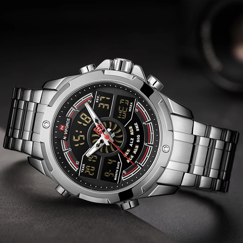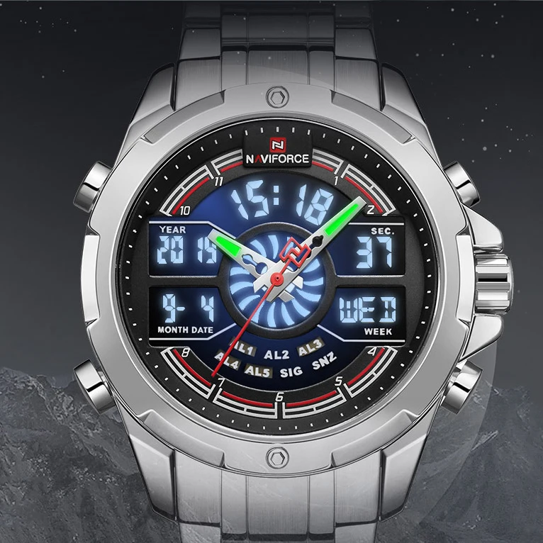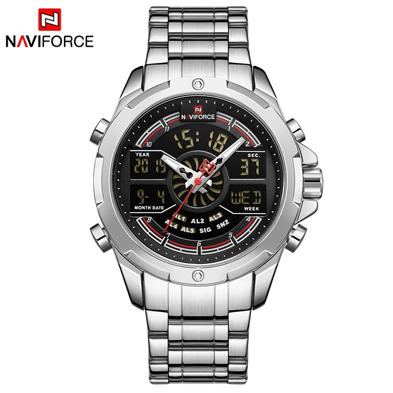 100% Новинка и высокое качествоСигнал тревоги с 4 мин, ПовторОтображение дня, даты и времениChrime на каждый часХронограф с функцией 1/100Двухъядерный процессорАналоговый и приёмник цифровой дисплейФункция EL (синий)Функция ежечасного боя часовБраслет из нержавеющей сталиReistant воды Технические характеристикиМатериал корпуса: нержавеющая стальДиаметр корпуса: 45 ммТолщина корпуса: 15,5 ммМатериал браслета: нержавеющая стальДлина ремешка (включая корпус): 230 ммШирина ремешка: 23 ммВес: 167 г Что входит в комплект100% NAVIFORCE новый брендЧасы с аналогово-цифровым дисплеем, будильником и голубой электролюминесцентной подсветкой-1 шт.
