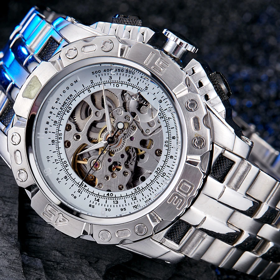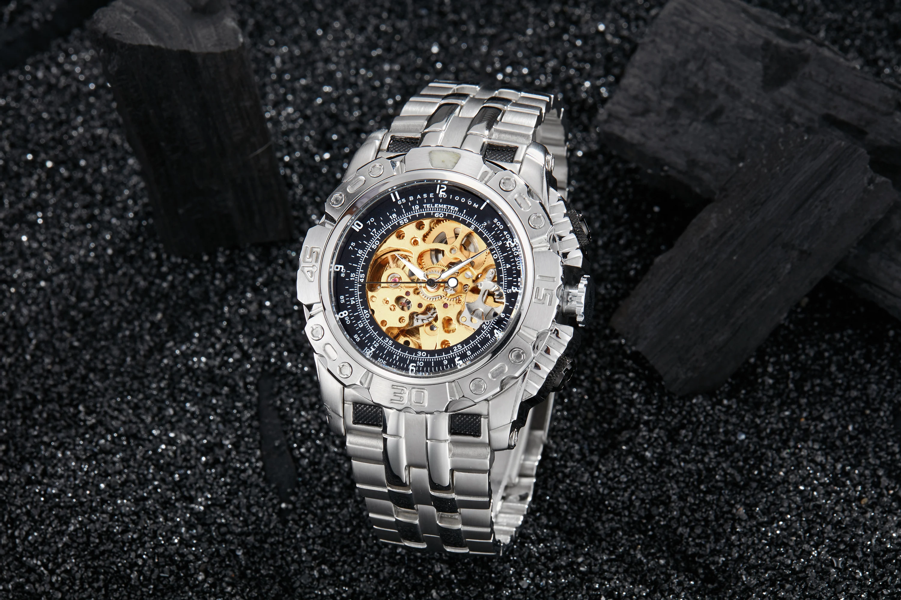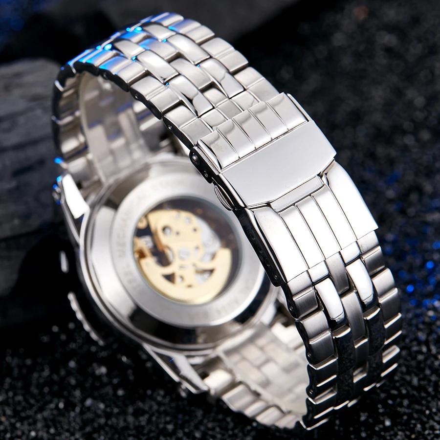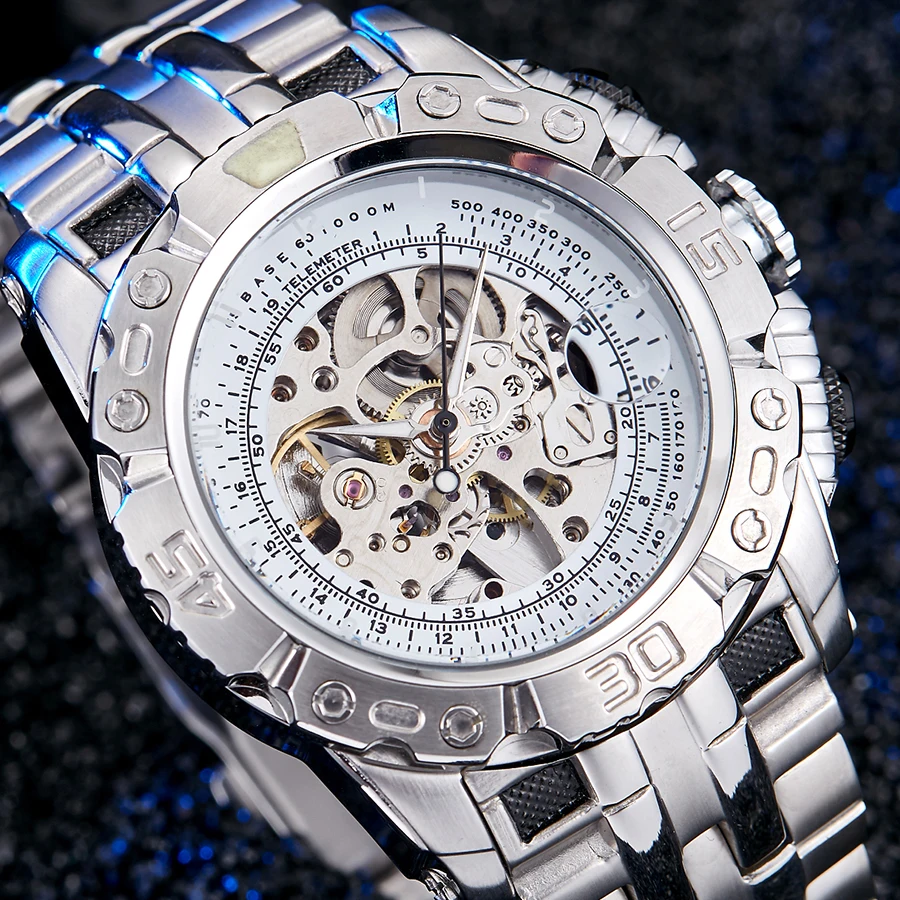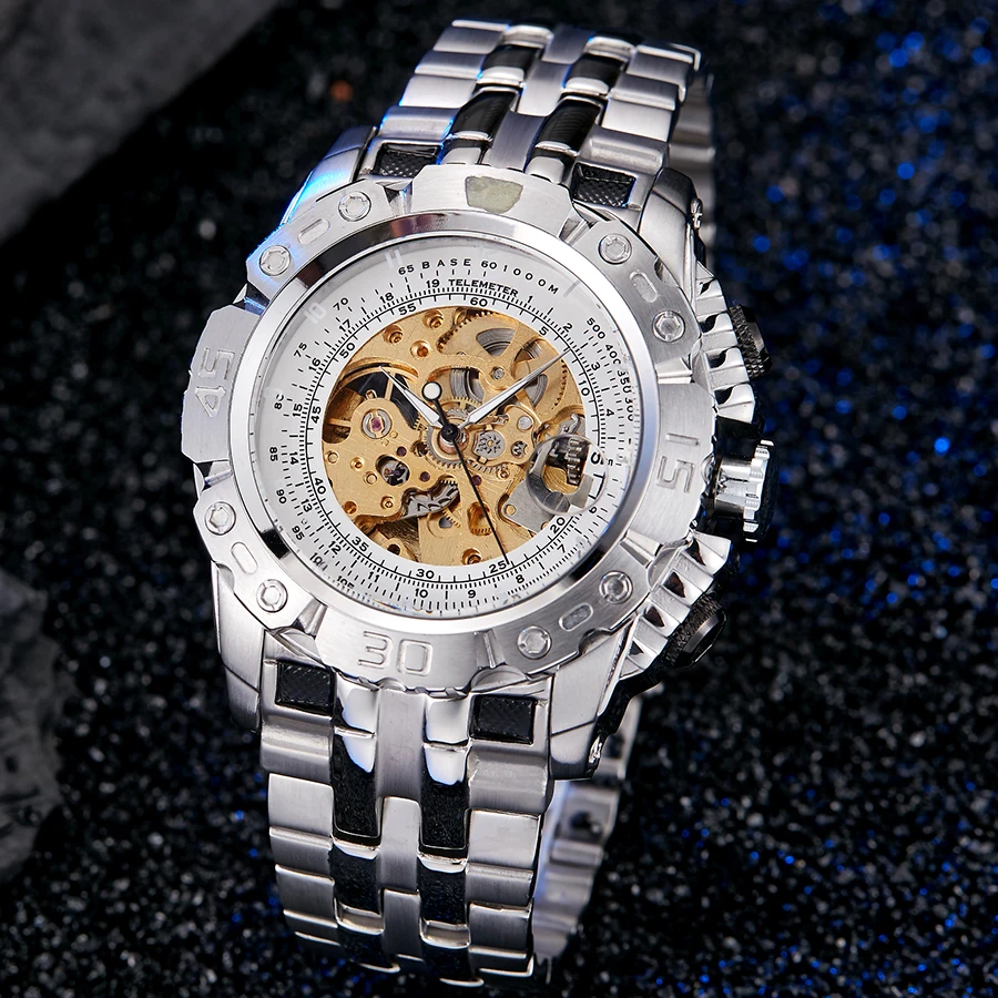Часы наручные мужские механические, брендовые Роскошные креативные автоматические с автоподзаводом, серебристыезолотистые