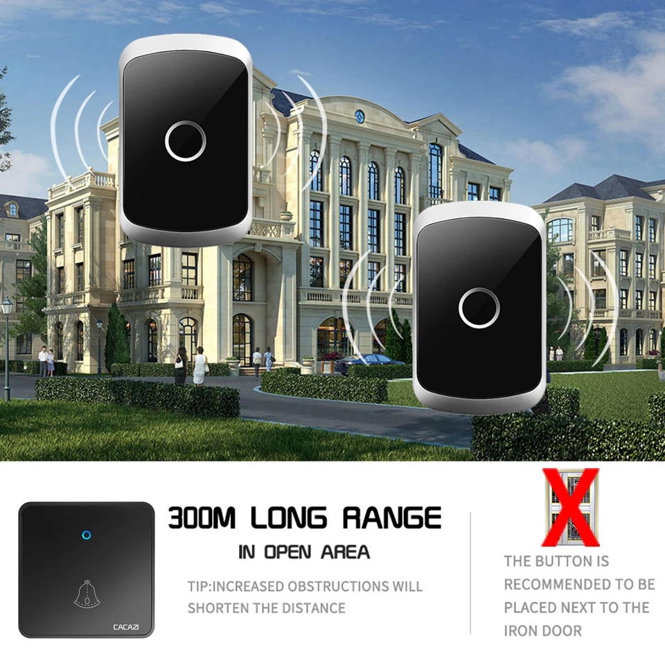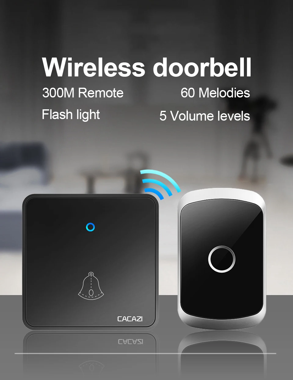 Домашний Беспроводной дверной звонок CACAZI, пульт дистанционного управления с батареей CR2032, Водонепроницаемый передатчик, вилка США, ЕС, Великобритании, приемник, 60 колец, 0-300 дБ, звонки