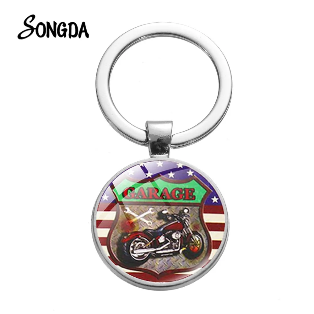 Брелок для ключей гараж мотоцикл ретро фото шоссе 66 США Флаг Печатный стеклянный Хрустальный брелок Изысканная сумка брелок Сувенир