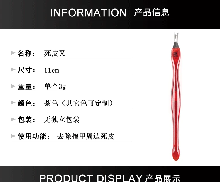 Brand:SHEENIA Size:11cm(4.33 inch) This Nail Art Tools Pedicure Cuticle Trimmer Remover Pusher Dead Skin Callus Removal Fork Brown Dual-end pusher for pushing and cutting nail cuticle. Suitable for professional salon use or home use. The spoon-like end (curved-end) is used for pushing cuticles - the design easily helps to shape the cuticles. The blade scrapes the hard-to-remove leftover skin residue on the nail and great for removing glue when using acrylic nails.