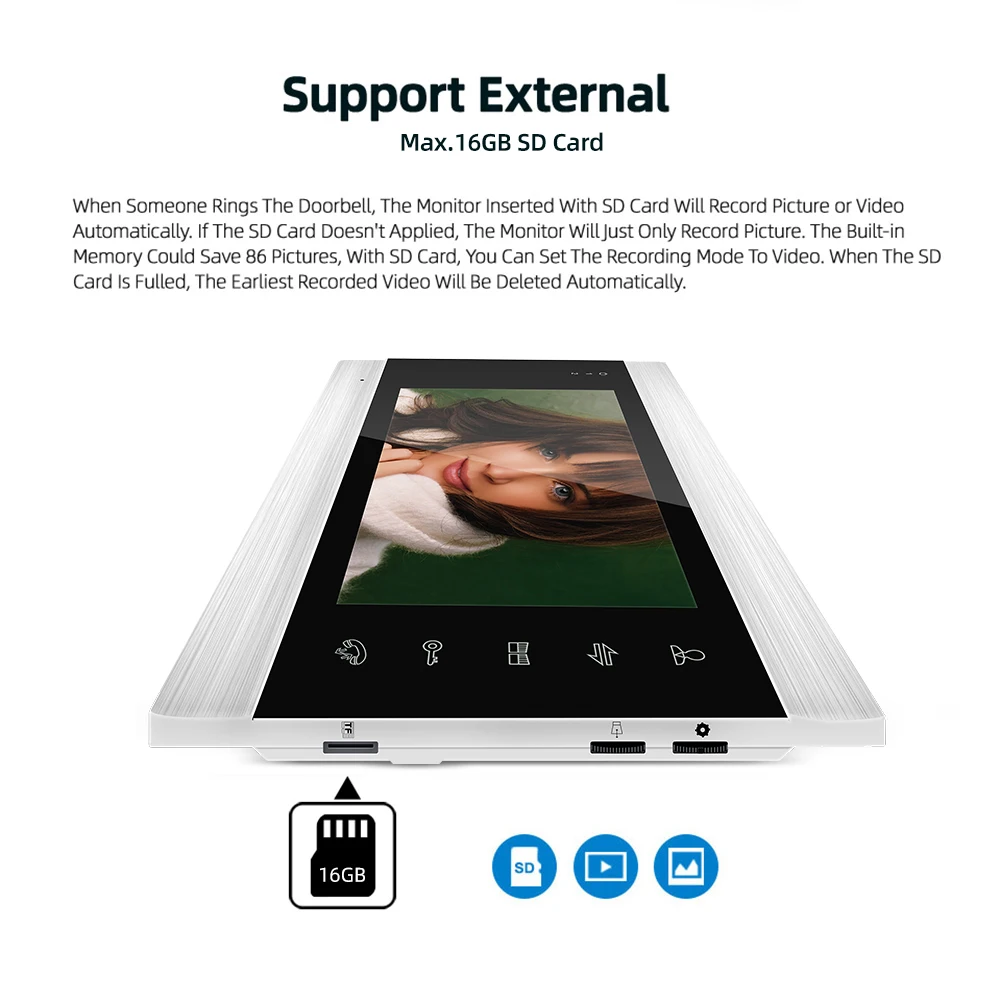 Когда кто-то звонит в дверной звонок, монитор, вставленный с sd-картой, будет записывать картинку или видео автоматически. Если sd-карта не применяется, монитор будет записывать только картинку. Встроенная память может сохранить 86 фотографий, с sd-картой, вы можете установить режим записи видео. Когда sd-карта будет заполнена, самое раннее записанное видео будет удалено автоматически.