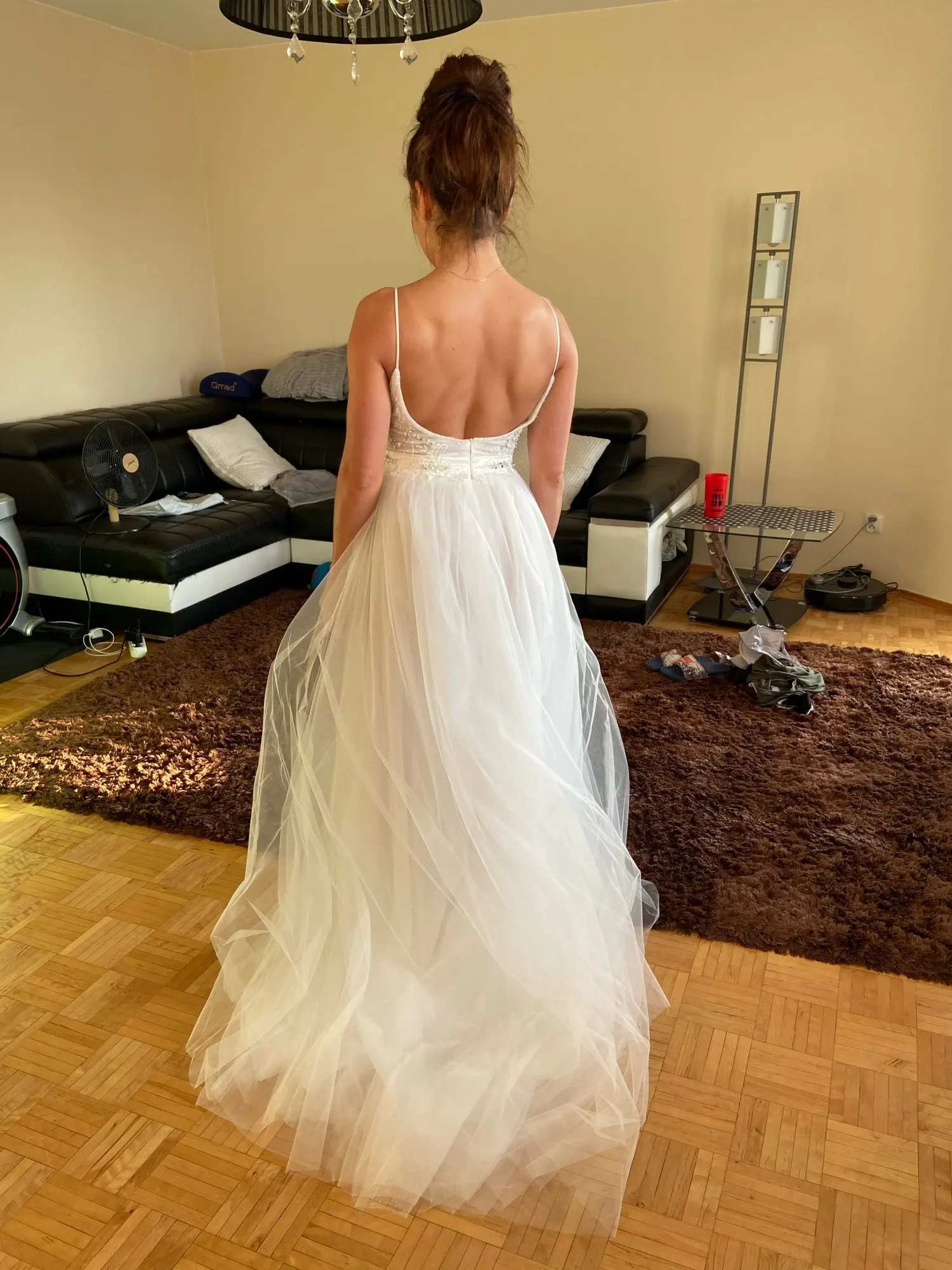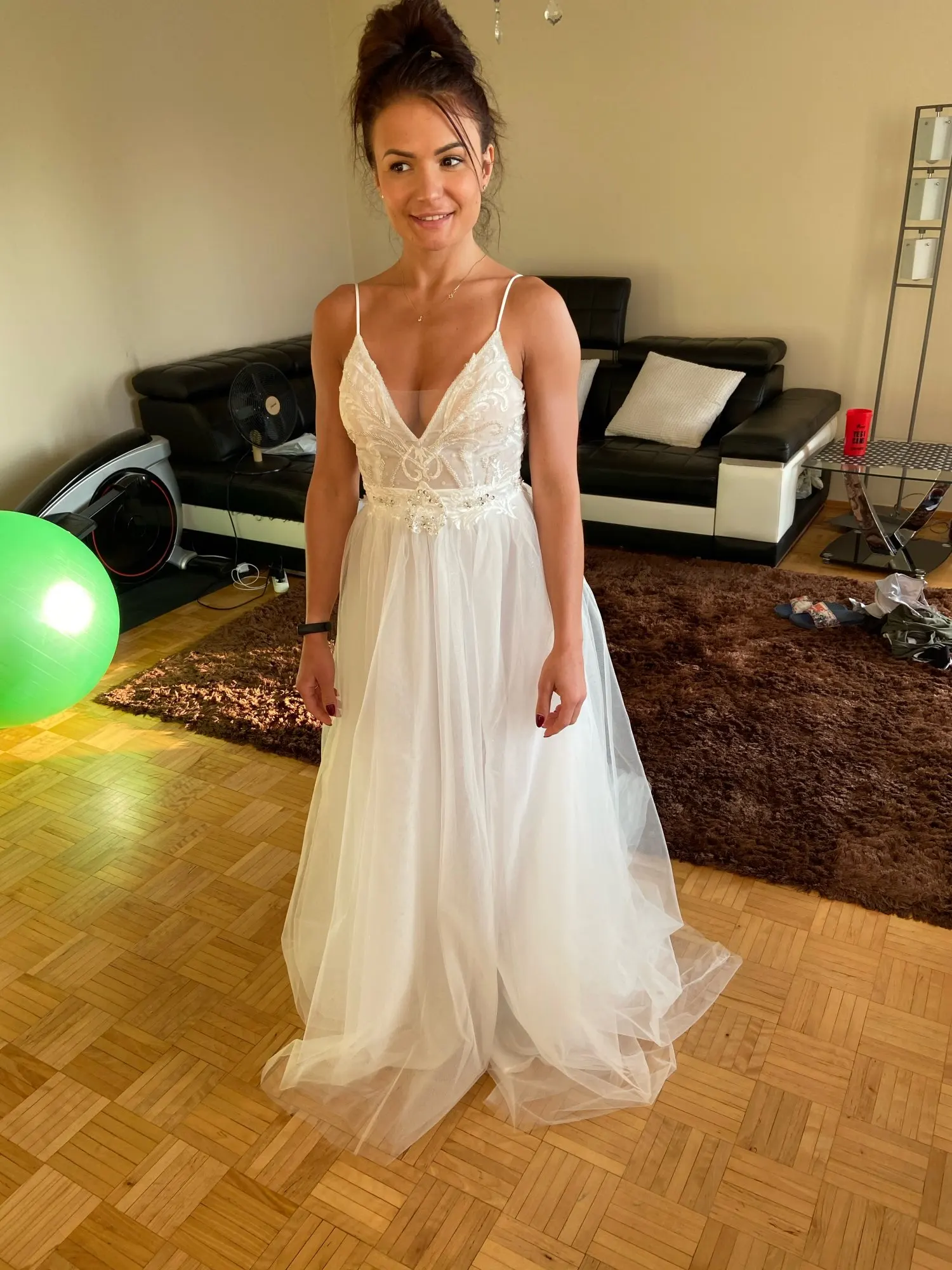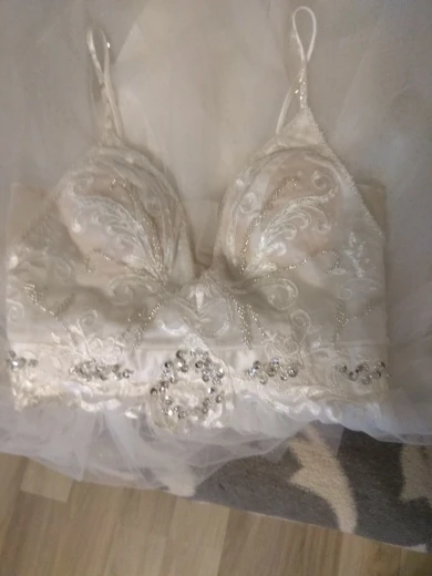 На фото платье цвета слоновой кости. На самом деле он просвечивается так, что вы видите цвет слоновой кости, на самом деле, это тон кожи модели. Вышивка по верху полностью отличается, и вы можете четко видеть прокладки для груди, так как весь верх просвечивается. Качество пошива ниже.