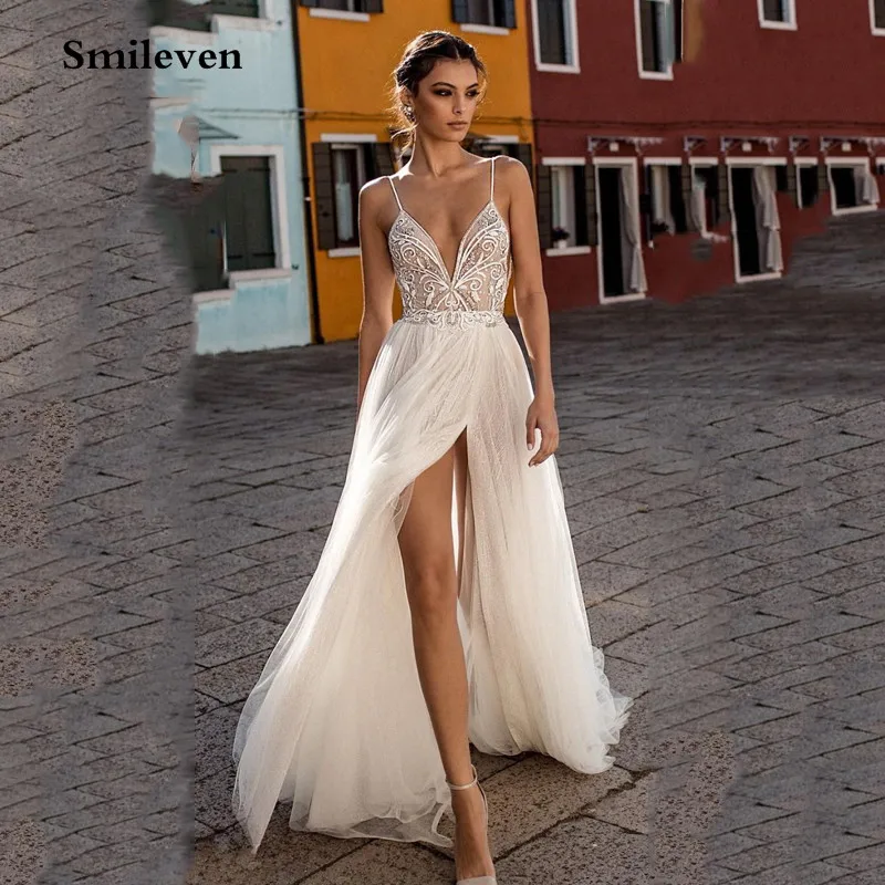 Женское богемное свадебное платье Smileven, кружевное платье с Боковым Разрезом, открытой спиной, на тонких бретелях, свадебное платье, свадебное платье-бохо