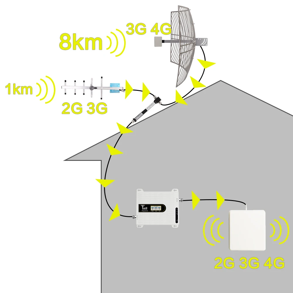 1. Повторитель сигнала 900 + 1800 + 2100 МГц 2. Наружная сетчатая антенна 3. Наружная антенна Yagi 4. Кабель 20 метров 5. Кабель длиной 1 метр * 2 6. Двухсторонний разветвитель мощности 7. В помещении панель с антенной