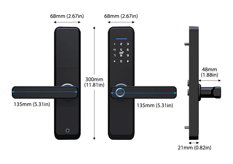 Tuya smart App/сканер отпечатков пальцев/Пароль/смарт-карта/разблокировка ключа Просмотр журналов доступа из приложения Поддерживает обычный режим открытия (свободный доступ) Размер врезного замка Английский Голос Волочения проволоки Панель Матовый чехол Толщина двери: 38-50 мм Универсальная как для правой, так и для левой двери