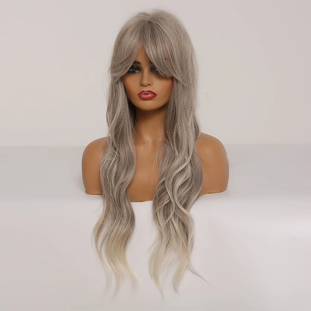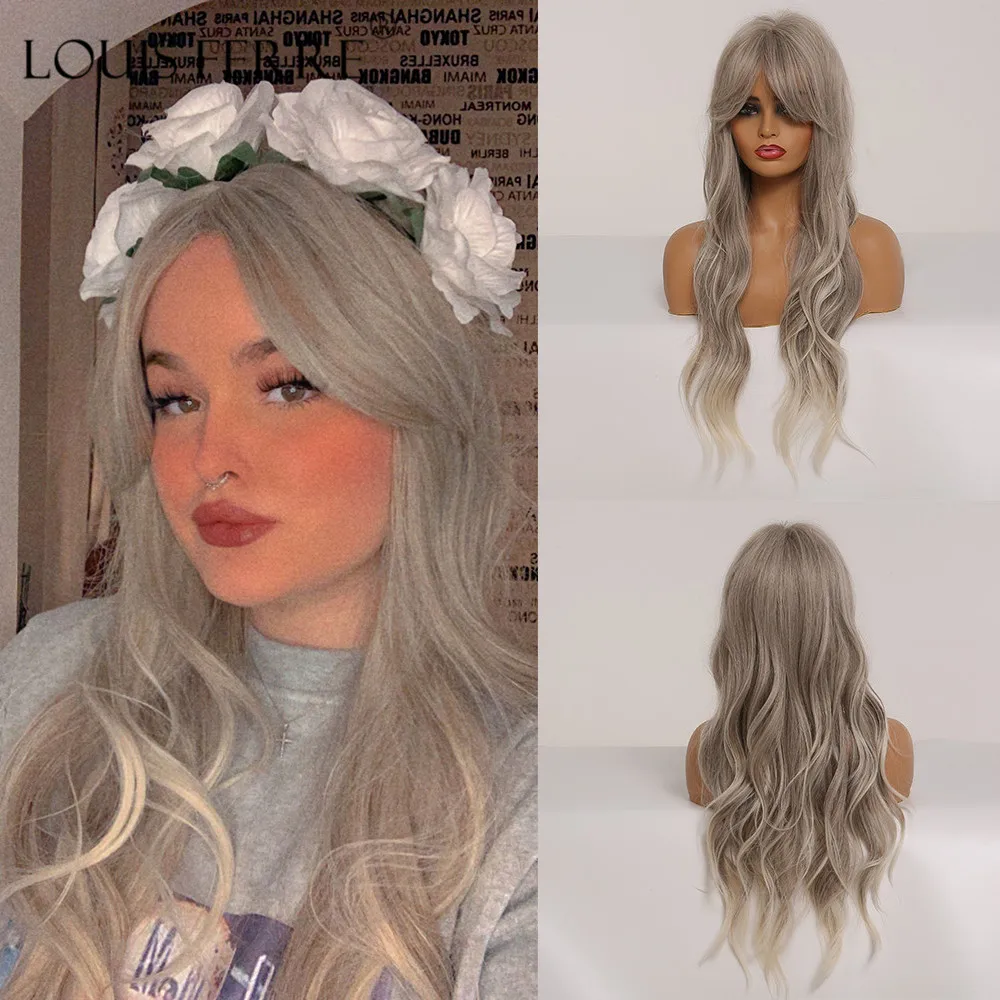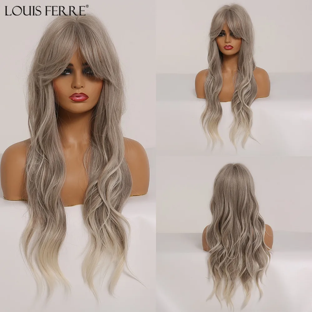 Длинные Серые синтетические парики LOUIS FERRE с эффектом омбре, пепельно-белые, светлые, для женщин, косплей, волнистый парик с челкой, термостойкий