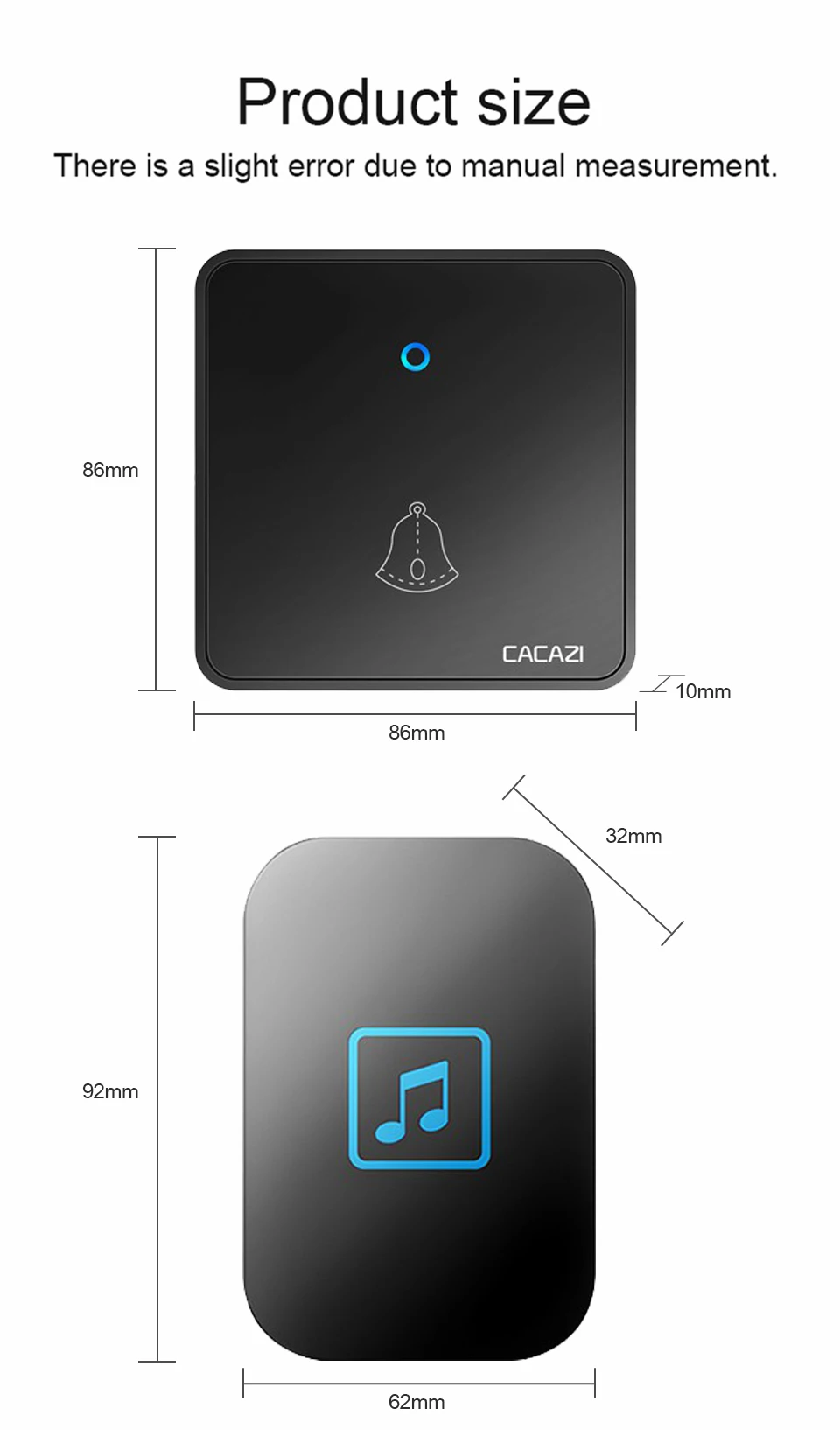 1. Кнопка поддерживает до 8 шт., а приемник поддерживает до 100 шт. 2. Если несколько кнопок сопряжены с одним или несколькими приемниками в одной системе, каждая кнопка может быть настроена на другой мелодию звонка. 3. Функция отключения питания: Включите питание снова после выключения питания, нет необходимости повторно регулировать и блокировать мелодию звонка. 4. Передатчик не имеет винтового зажима, и он может быть водонепроницаемым и пыленепроницаемым без резинового кольца. 5. Передатчик использует щелочную батарею CR2032 (не входит в комплект). 6. Напряжение приемника: 110-220 В. 7. Приемник доступен в различных вилках, США/ЕС/Великобритании Вилка и AU адаптеры, подходит для большинства стран. 8. Расстояние приема: 300 м на открытой местности. 9. На беспроводной сигнал будут влиять препятствия. Чем больше препятствий, тем тяжелее потеря сигнала. 10. Приемник имеет 5 уровней (может быть отключен) 0-110 дБ, 60 музыки на выбор. 11. Размер: передатчик 86x86x10 мм, приемник 92x62x32mm. Примечание: Кнопка не может быть размещена на железной двери, потому что это будет мешать сигналу.