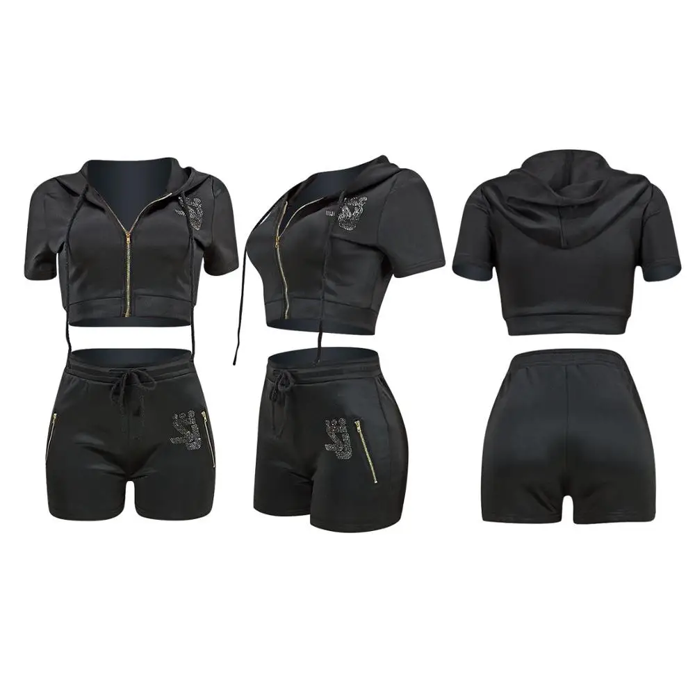 Женский Повседневный комплект из двух предметов, неоновая толстовка с капюшоном и короткими рукавами, с надписью, со стразами, короткий топ и шорты, спортивный костюм для женщин
