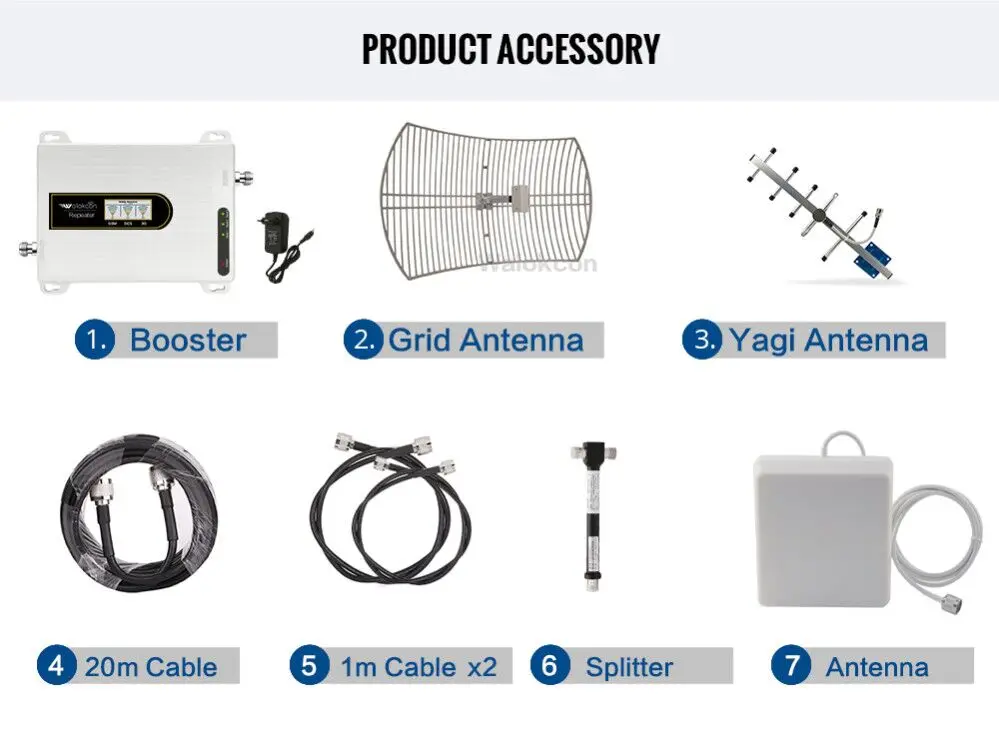 1. Ретранслятор 900 + 1800 + 2100 МГц2. Наружная сетчатая антенна3. Наружная антенна Yagi4. 20-метровый кабель5. Кабель длиной 1 метр6. Двухсторонний разветвитель мощности7. Крытый панель с антенной