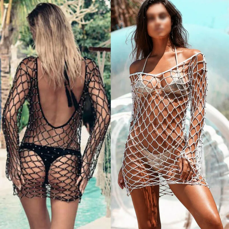Летние женские сетчатые накидки, пляжные купальные костюмы с жемчужинами, ажурное пляжное платье