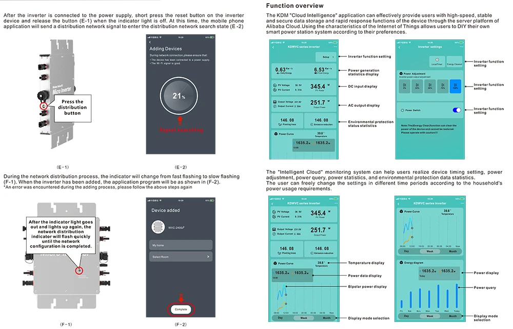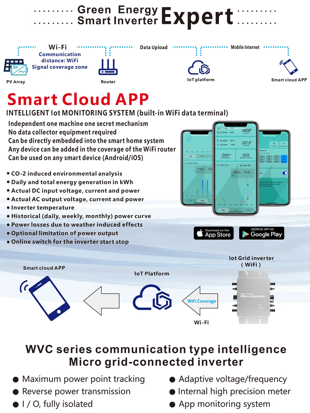 WVC1400-WiFi версия с использованием водонепроницаемого обтекаемого дизайна IP65, может эффективно предотвращать эрозию дождевой воды на поверхности, встроенная высокопроизводительная функция отслеживания максимальной мощности (MPPT), лучше отслеживать изменения солнечной яркости и контролировать различную выходную мощность, эффективно улавливать и собирать солнечный свет. Передача электрической энергии переменного тока с использованием технологии обратной передачи, является одной из наших запатентованных технологий, выходная мощность инвертора может обеспечить приоритетное использование нагрузки, дополнительное электричество в сетку, эффективное использование инвертора к излучаемой мощности, скорость передачи электроэнергии до 99%.