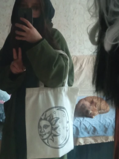 Принт не такой темный как на фото, материал хз, вроде нормальный, не просвечивает, размер как на фото. Впринципе довольна покупкой, но 300 рублей слишком дорого для такой сумки, вот 100 нормально.