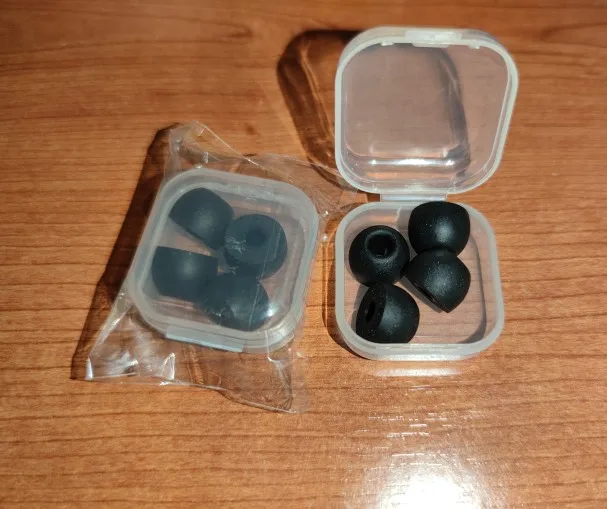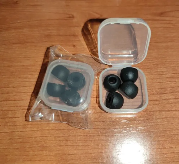 Пришло 4 насадки в кейсе Изначально брал для airdots, пришлось подрезать чтоб наушники влезали в бокс. По звуку разницы между этими насадками и стандартными от airdots нет (хотя многие пишут что лучше слышен басс). Для дотсов посоветовал бы поставить обычные резиновые самого большого размера эффект тот же. А вот на дешёвых китайских проводных затычках действительно будто басы стали ярче. Хорошо что продавец прислал 2 пары.