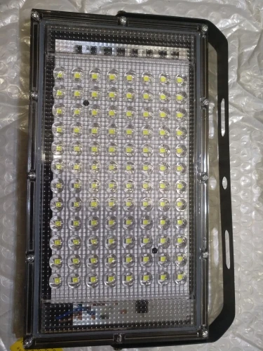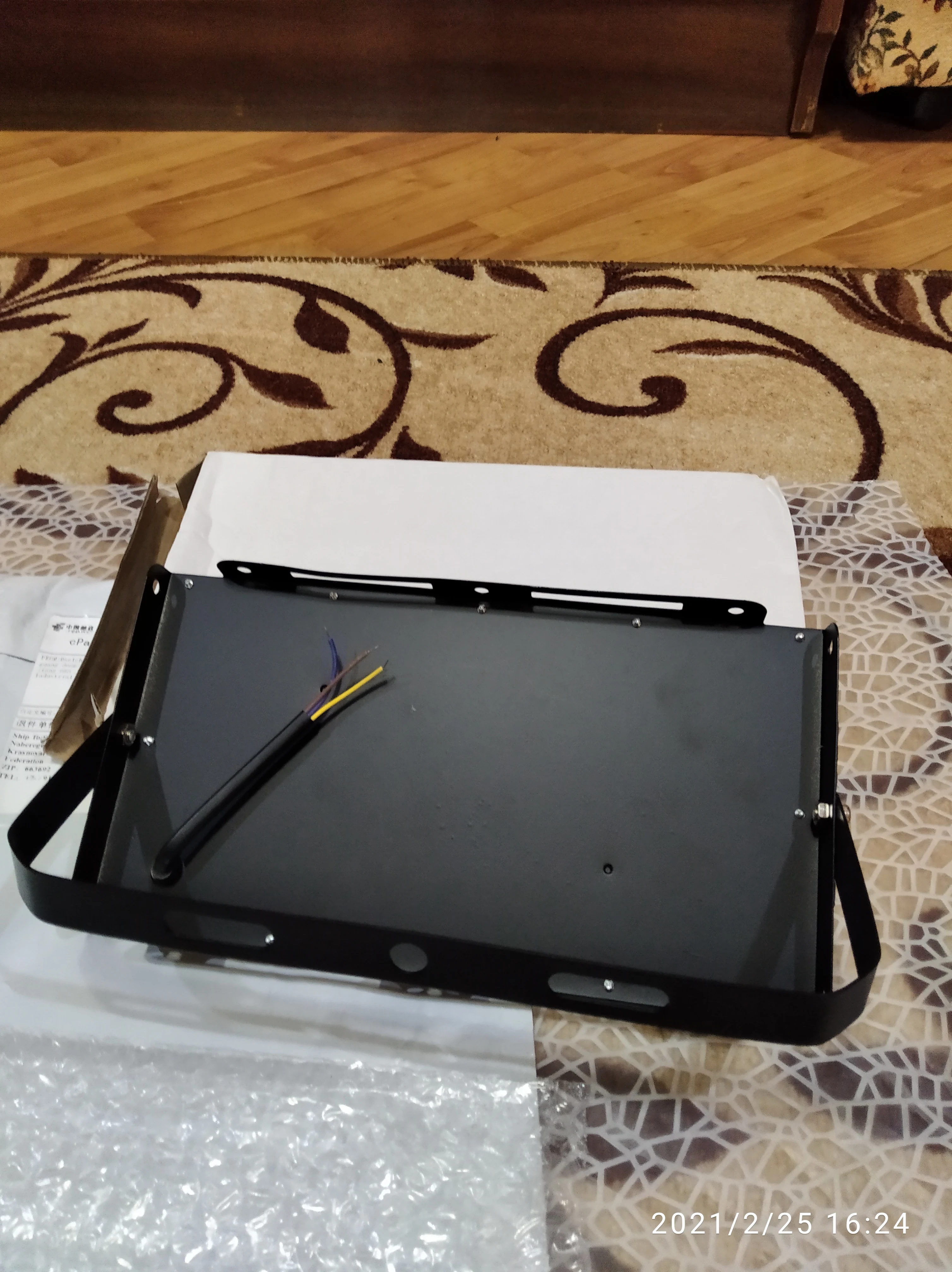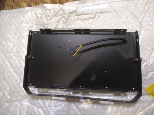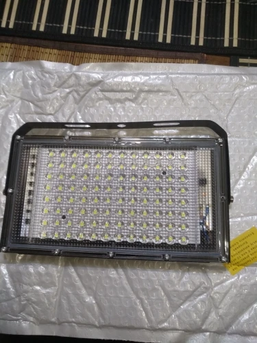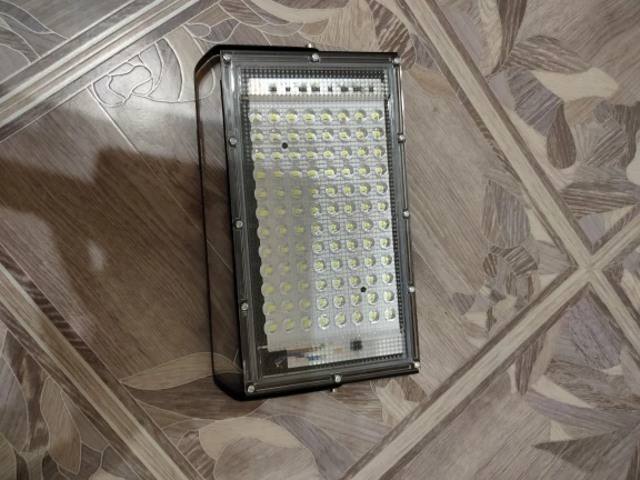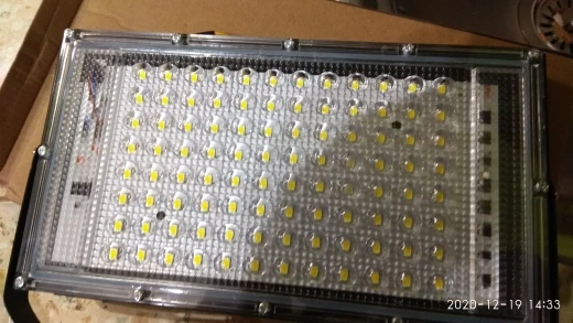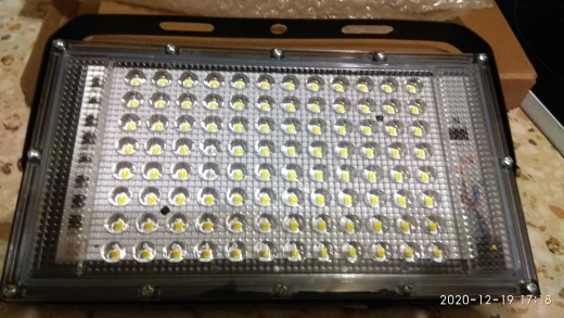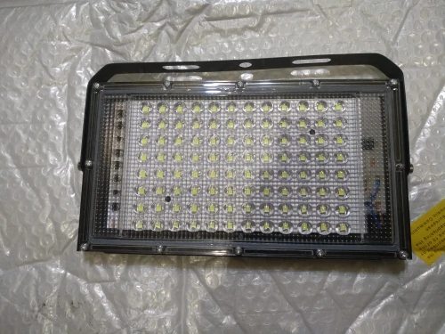 Описанию почти соответствует. Потребляемая мощность 75 Вт. 96 светодиодов 24S4P, 8 драйверов JW19818 (100mA) в параллель. Необходимо дополнительно установить радиатор или хороший обдув. Минусы: корпус - лист алюминия толщиной 0,6 мм, а не 1,4 мм как заявлено; нет радиатора охлаждения - возможность перегрева и быстрого выхода из строя; короткий питающий провод; Заземление не предусмотрено. Плюсы: цена 8 р за 1 Вт; Вес <300 г; крепление металлическая полоса 0,8 мм; поворот 180 град.; защита от дождя. Упаковка: белый пакет с пупыркой, тонкая картонная коробка. Доставка 10 дней.