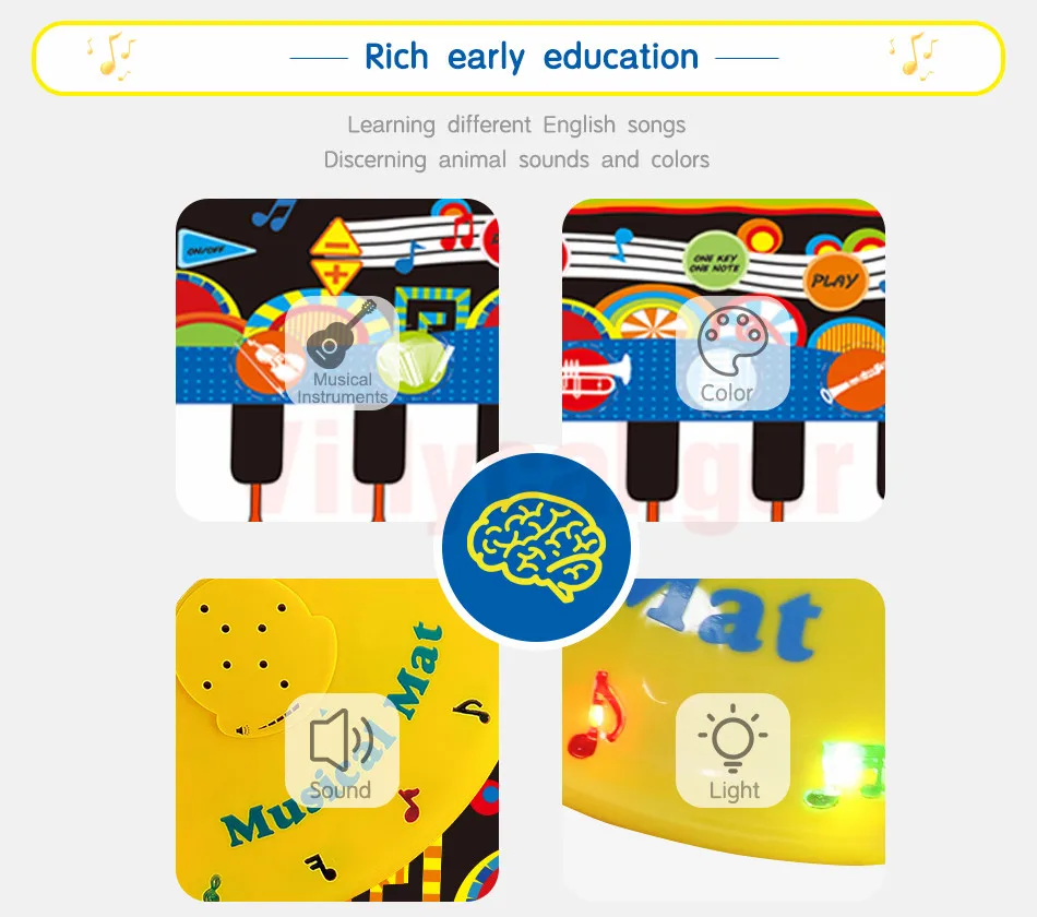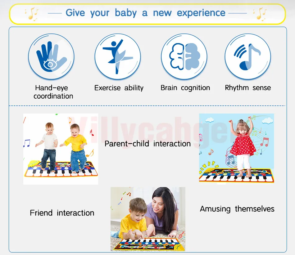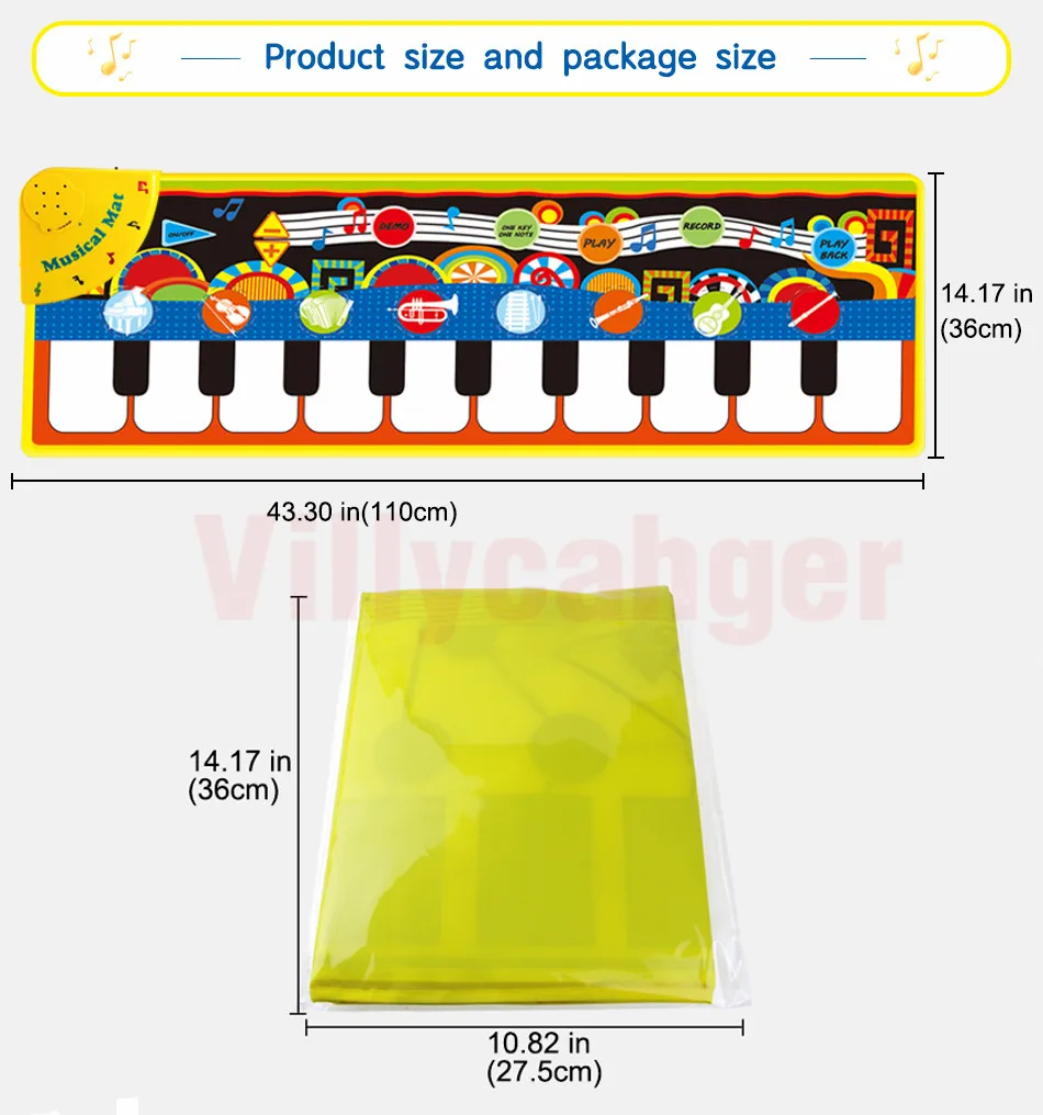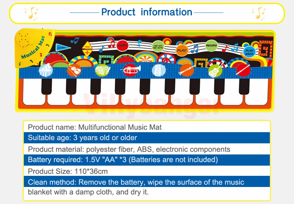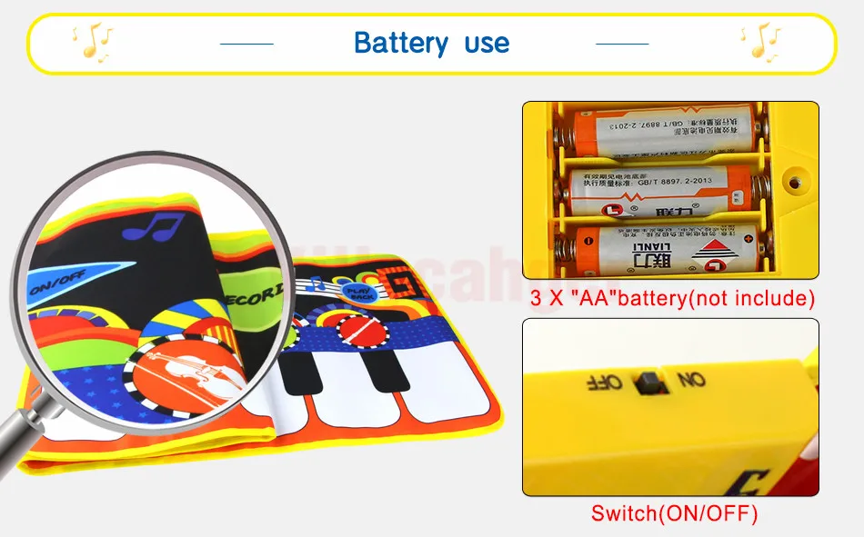 -Музыкальное одеяло имеет нескользящий слой. Но будьте осторожны при выполнении напряженных упражнений на гладкой поверхности. -За Младенцами и малышами необходимо следить родители, чтобы избежать падения во время игры Коврик для пианино. -Пожалуйста, используйте цинко-марганцевые сухие батареи для этого музыкального коврика. Щелочная батарея может сжечь доску.