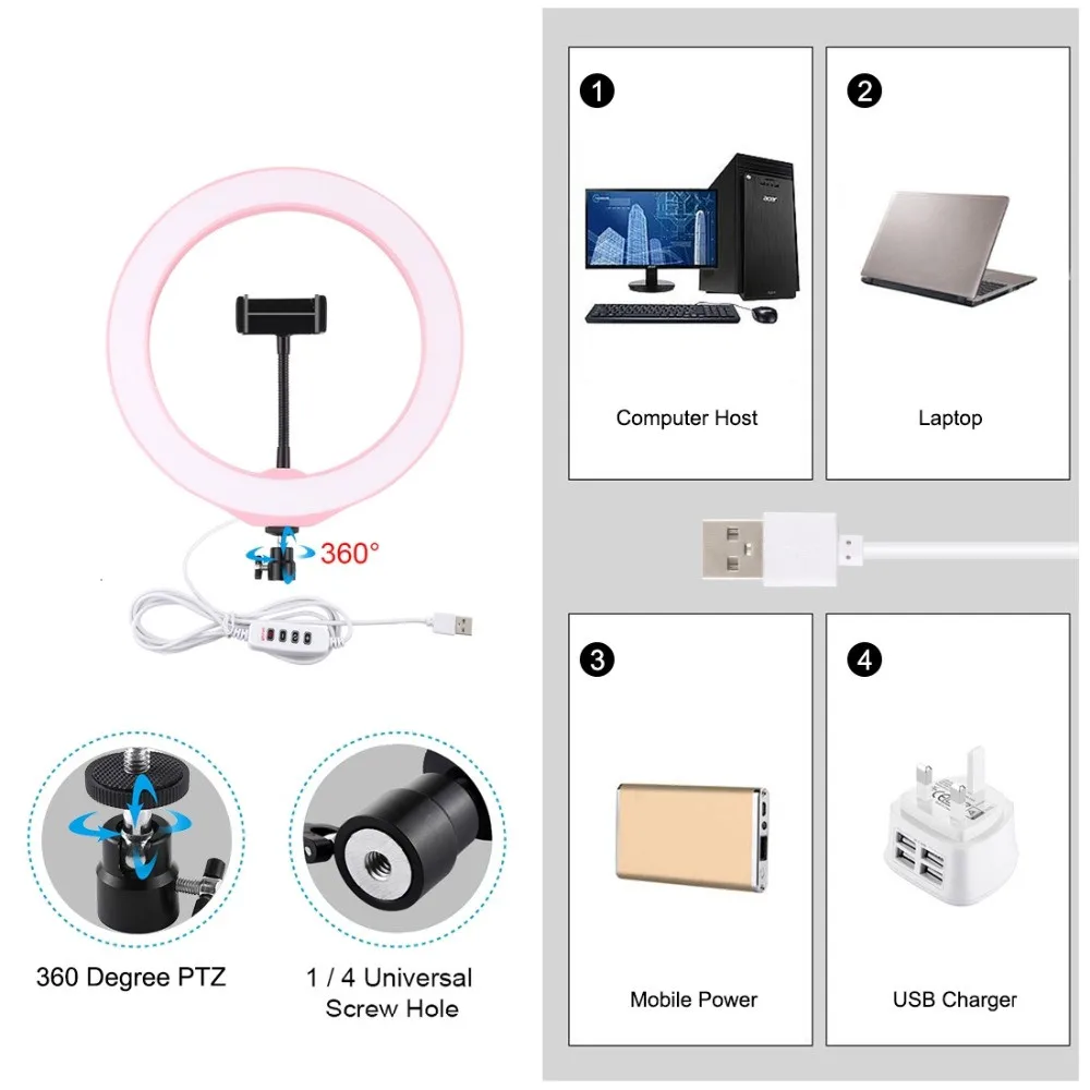 1. Светодиодный светильник-кольцо может быть установлен на держателю и взять его в любом месте, его также можно снять с подставки в любое время, шаровая Головка штатива может вращаться на 360 градусов, можно свободно регулировать под любым углом (держатель не входит в комплект).