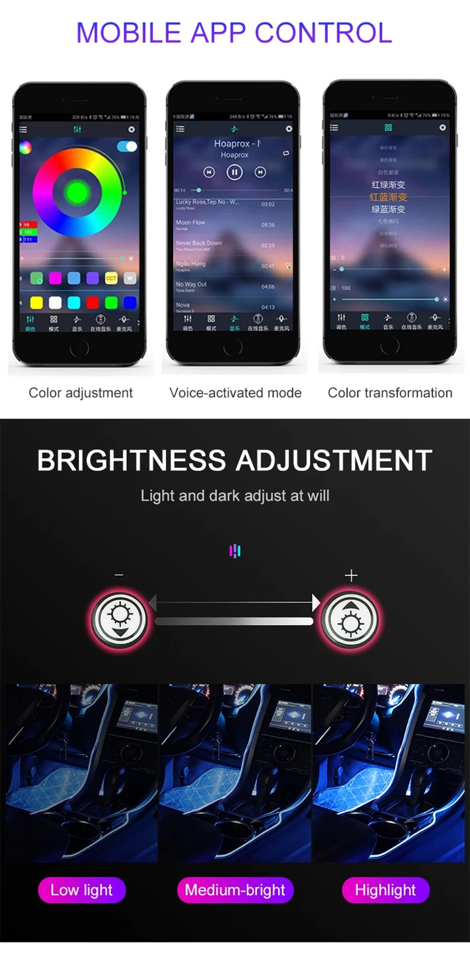 2. Музыкальное украшение-комплект разработан так, чтобы быть простым, а также обеспечивает элегантность внутри автомобиля при езде ночью или наслаждении музыкой. И поскольку она имеет звуковой датчик, система свечения под автомобилем синхронизируется с музыкальным ритмом.
