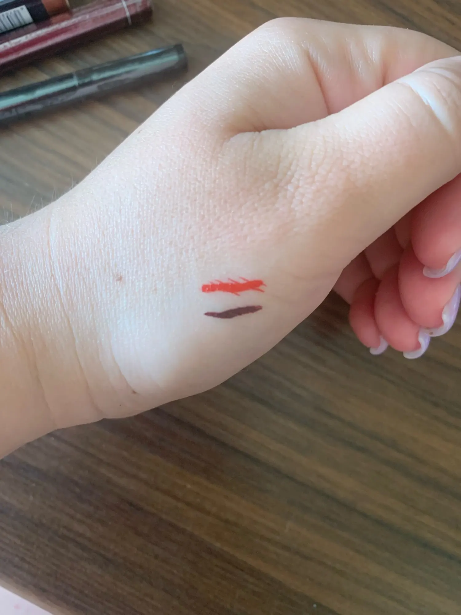 Очередной маркер с твёрдым апликатором, с которым я видимо просто не умею работать. Для плотного цвета придётся пару слоёв сделать. Но в любом случае этот маркер намного лучше аналогичного принципа другой марки- наносится без проплешин, на глазу рисует(а не только на руке), спокойно наслаивается не сдирая предыдущий слой. Держится пока хорошо, пальцем не смазывается, разве что мокрым, если потереть прям.