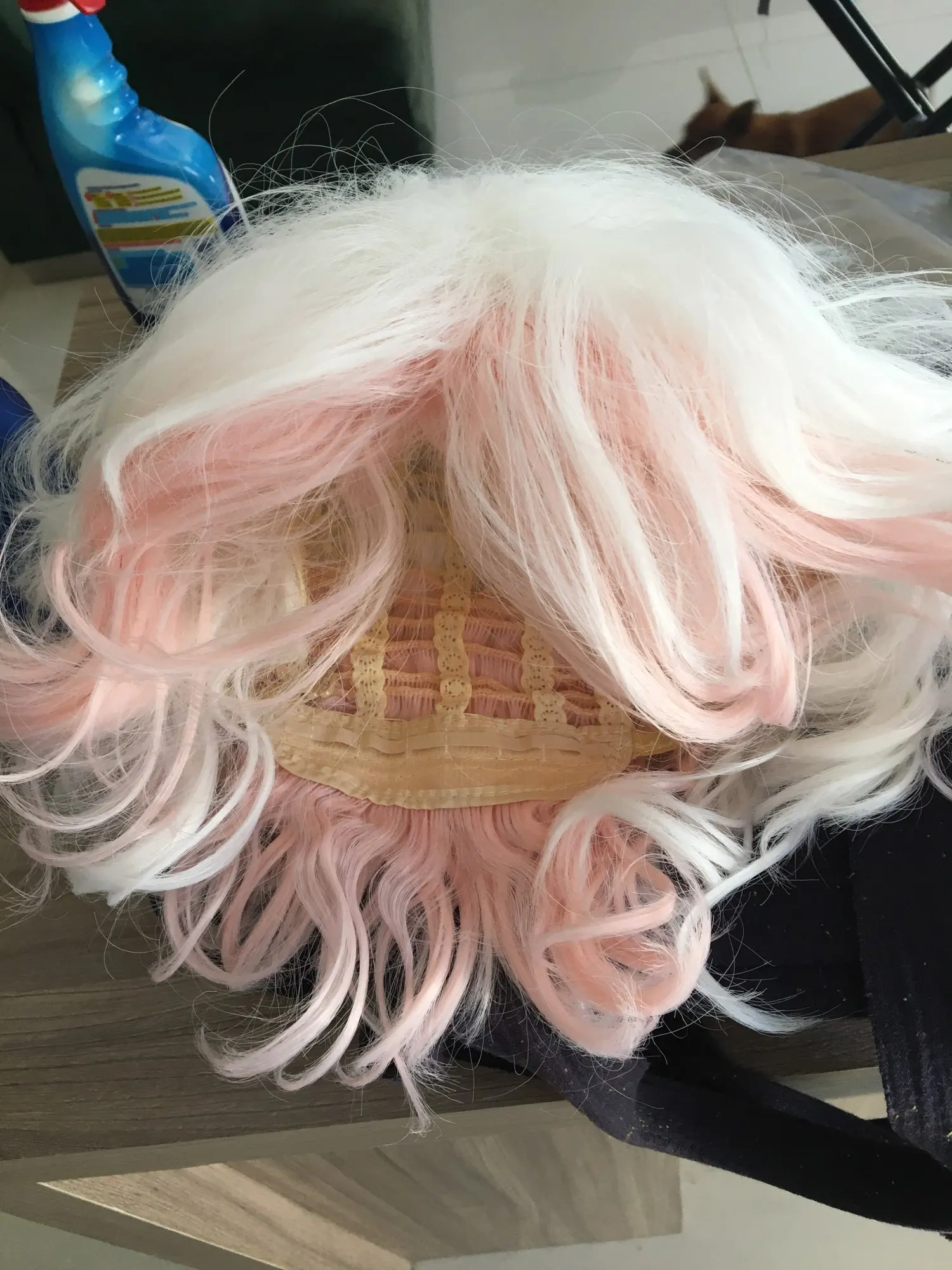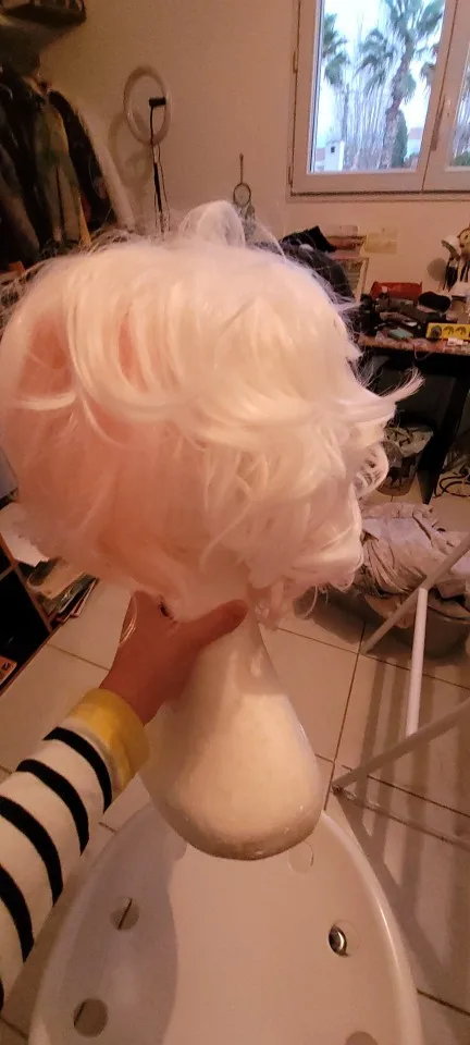 Я в восторге. Парик просто идеален! Это хорошо вырезано и достаточно немного галстука, чтобы держать фитиль. Розовый и белый хорошо согнуты. Идеально!!