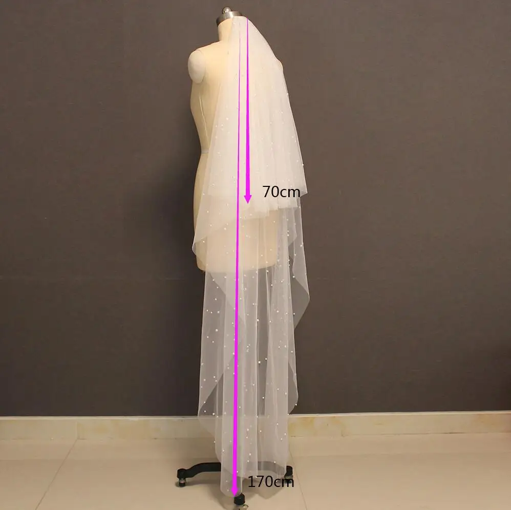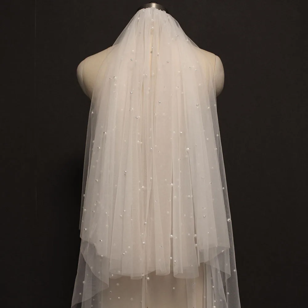Фата свадебная двухслойная с жемчугом, Длинная с покрытием, мягкая с жемчугом, Белыйцвет слоновой кости, свадебные аксессуары