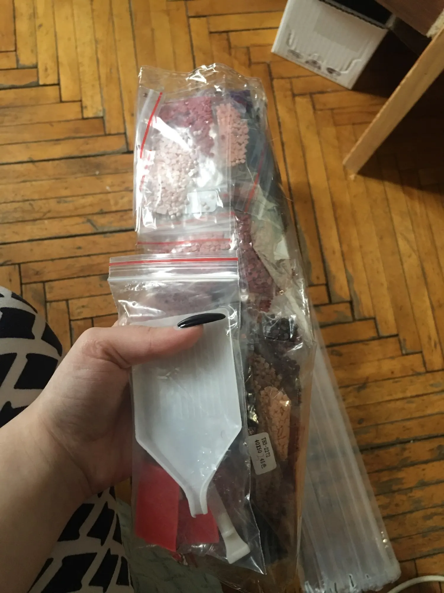 Доставка в Самару с 18 февраля по 12 марта. Посылка пришла в пакете с пупыркой. Полотна намотаны на валик. Погрешность самого изображения по 0.5 см с каждой стороны. Воздуха под полотном и заломов нет. Информ. листа нет, но обозначения все на полотне. Все стразы на месте и упакованы в зип.пакеты. Инструмент для каждого полотна одинаковый: лоток с носиком, стилус с насадкой для пальчиков, насадки на 3 и на 10 стразиков, 2 галлерты и пинцет. Пропечатка понятная и яркая. Клей на липком слое пахнет, но терпимо. Мамочкам на заметку мотив алмазной вышивки, для деток в комнату. Продавца рекомендую.
