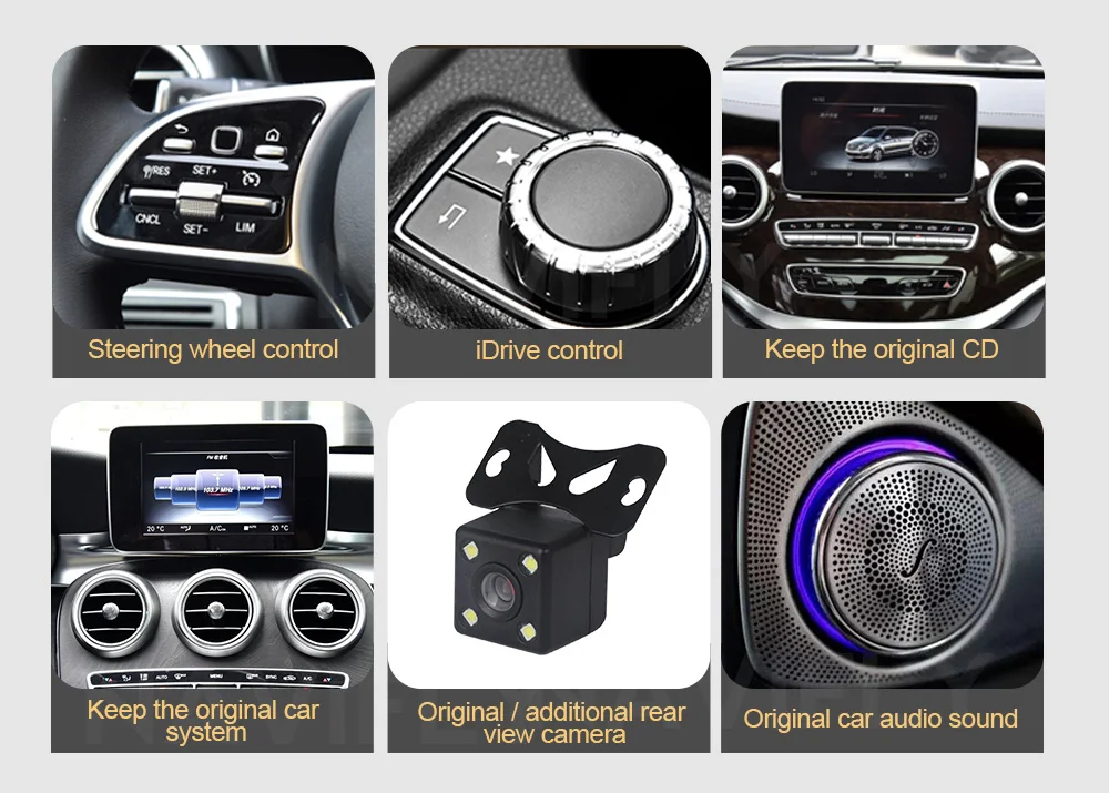 > Двойное преобразование системы, оригинальная система Mercedes Benz NTG и система Android.> Поддержка оригинальных функций NTG, таких как заводское радио, GPS-навигация, BT , DVD/CD,USB,SD и т. д., поддержка заводской камеры заднего вида. Камера 360, устройство открывания двери, совместимо с джойстиком origianl, сенсорной мышью и управлением на рулевом колесе, совместима с оригинальной звуковой системой и оптоволокном, воспроизводит звук без потерь.