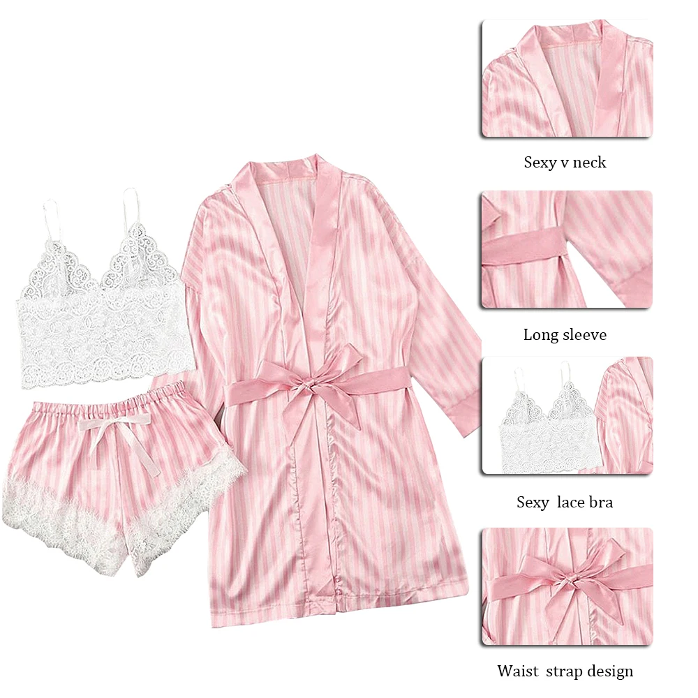 Женская пижама с длинным рукавом, сексуальное кружевное нижнее белье, ночное белье, нижнее белье, одежда для сна, костюм из 3 предметов, пижамные комплекты для женщин, женская пижама