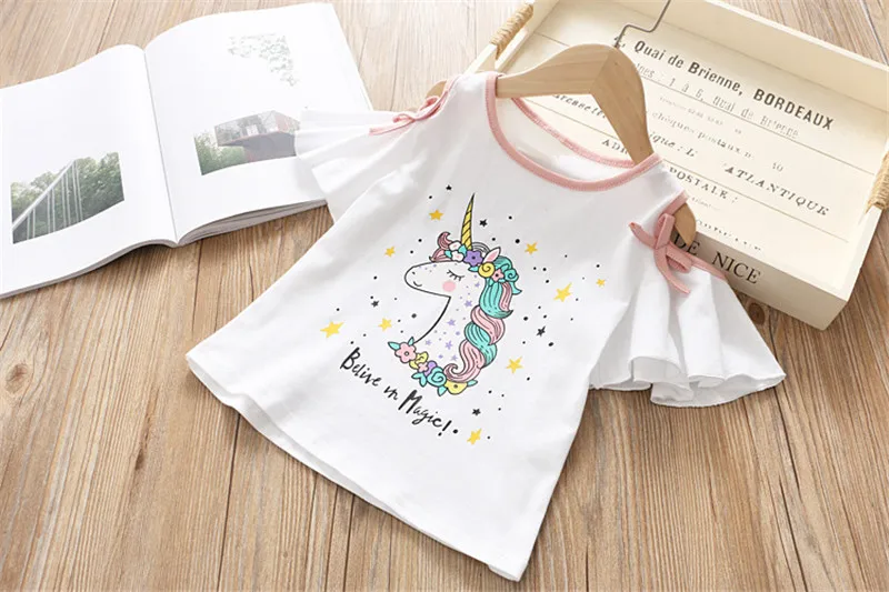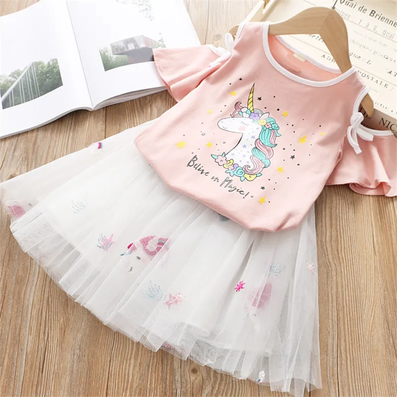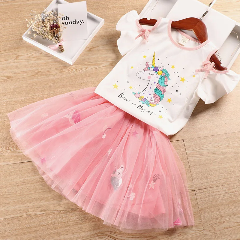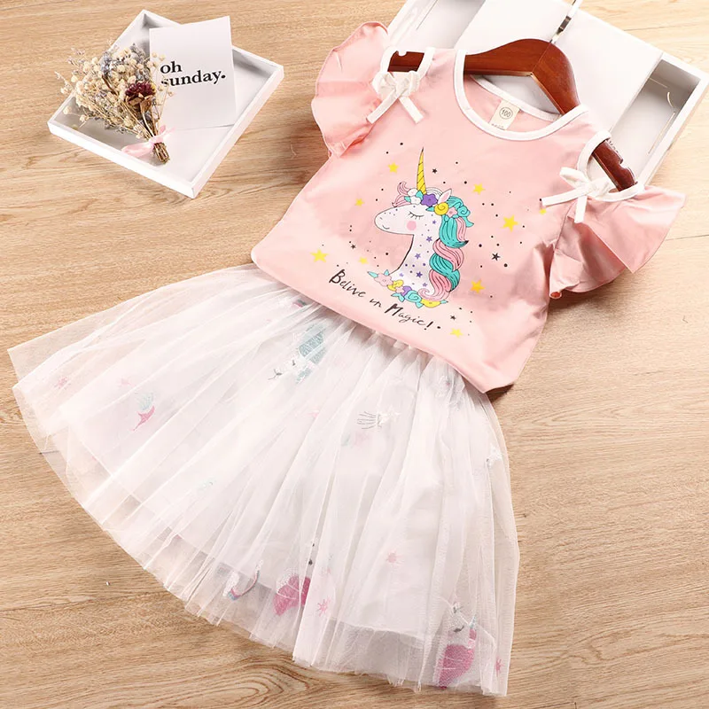 Thunderersлетний комплект одежды из 2 предметов для маленьких девочек, Футболка с рукавами-крылышками и единорогом + сетчатая юбка, комплект одежды