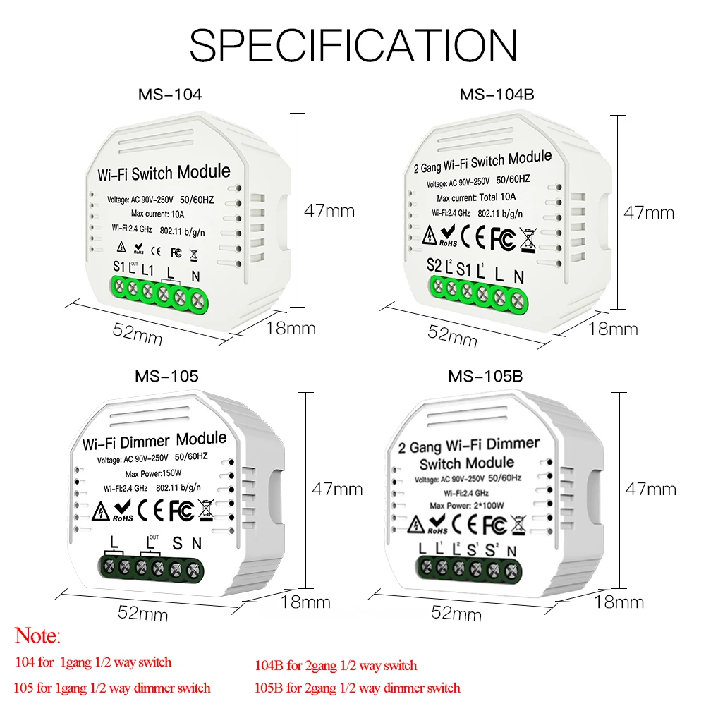 MS-104B:2 группы 1/2 способМодуль переключателя Тип продукта: 2-канальный модуль переключателя Wi-Fi