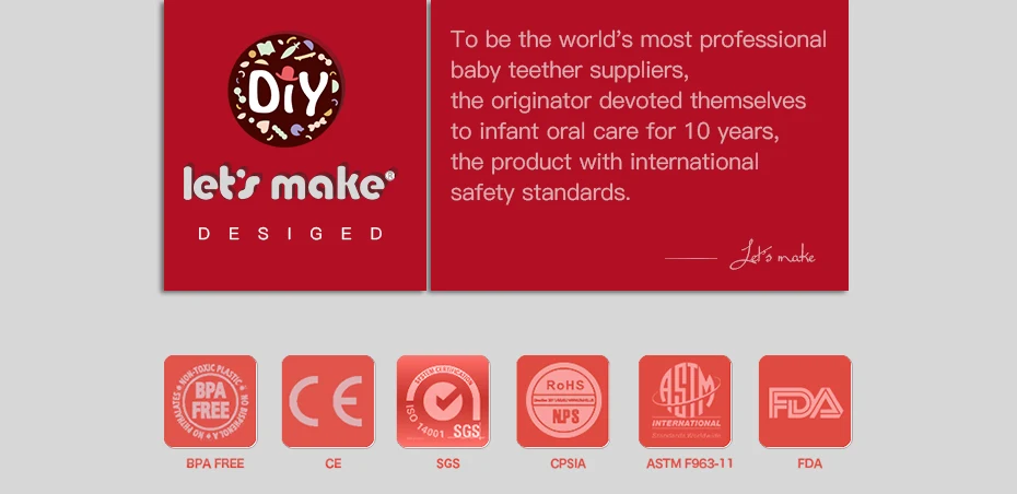 Let's Make-это профессиональный бренд детских прорезывателей в мире. Мы имеем нашу собственную фабрику и поставляем большое количество оптовых продаж. И у нас есть профессиональная команда по разработке и дизайну в мире, с рядом патентов на продукцию и авторских прав. Магазин Jimmy Hu теперь является одним из лучших в отрасли и поддерживает оптовых и розничных продавцов. Комплексная команда обслуживания позволяет решить любые проблемы клиентов. В то же время, компания предоставляет эксклюзивные каналы продаж для VIP клиентов, индивидуальные, проектированные, общающиеся и другие специальные услуги VIP клиентов.