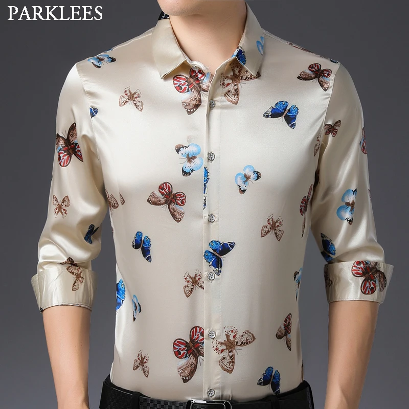 Модная шелковая атласная рубашка с принтом бабочек, мужская приталенная рубашка с длинным рукавом, Повседневная гладкая рубашка для вечеринок, светского клуба, для мужчин